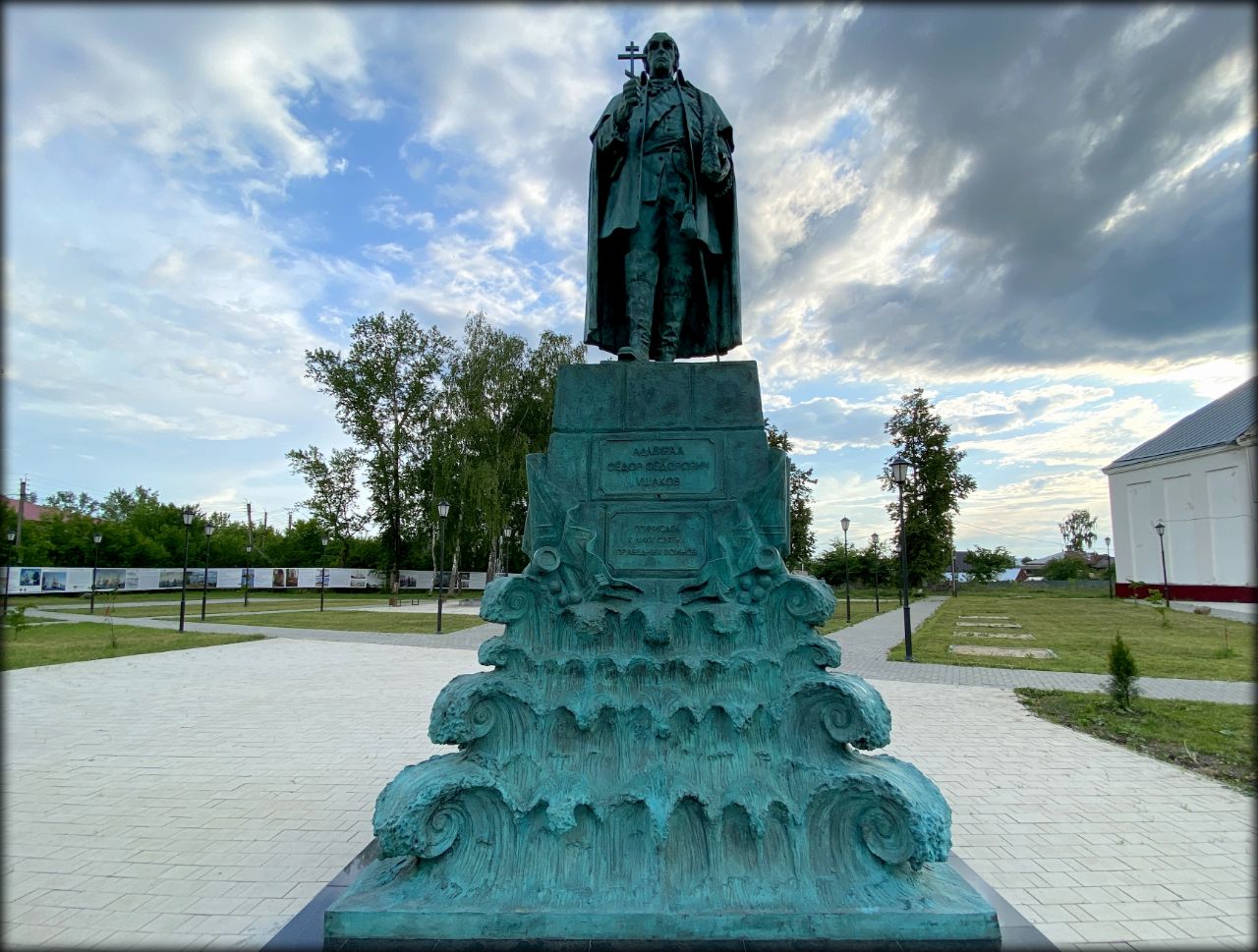 Бюст я не видел, но сфотографировал новый памятник, установленный на центральной площади города в 2019 году. Как вы знаете Ушаков это знаменитый русский флотоводец, командующий русско-турецкой эскадрой в Средиземном море, которого на всём Востоке называли непобедимый «Ушак-паша». Фёдор Фёдорович одержал победу в 43 морских сражениях и не потерпел ни единого поражения.