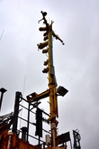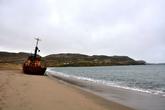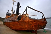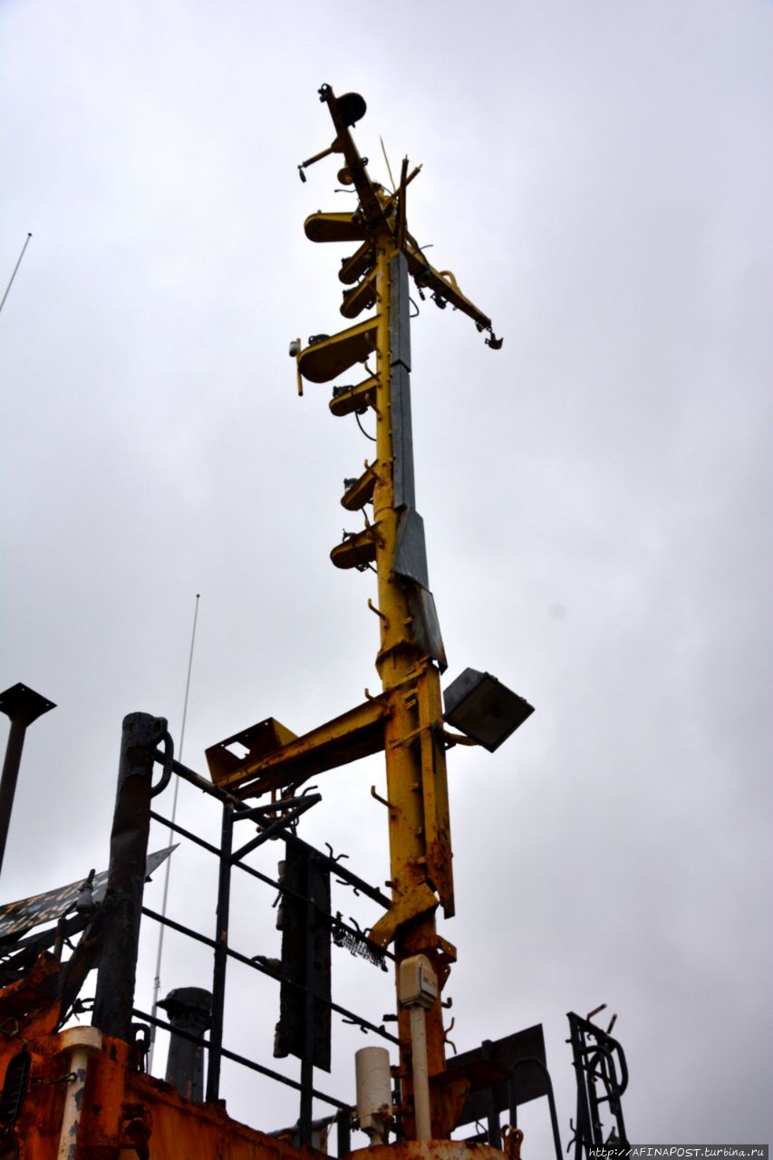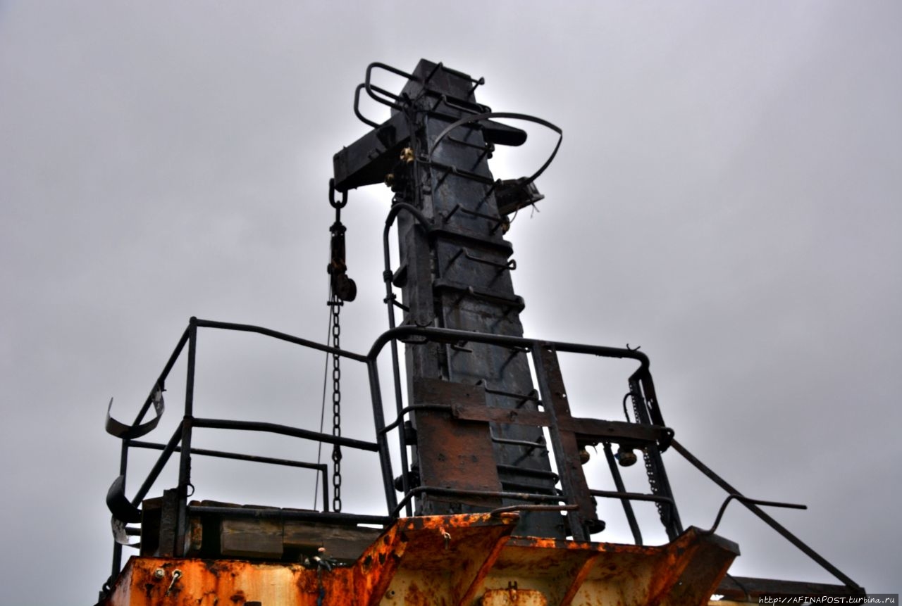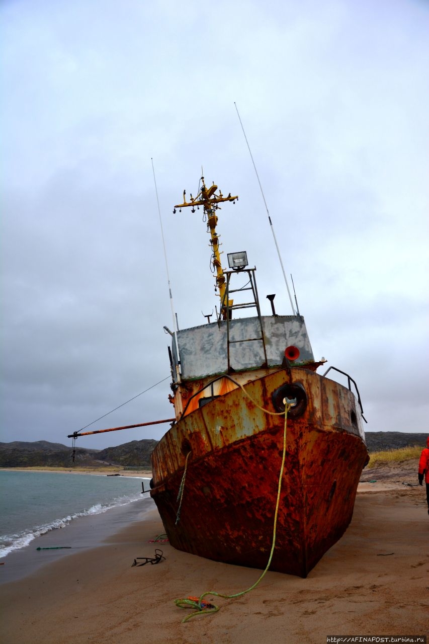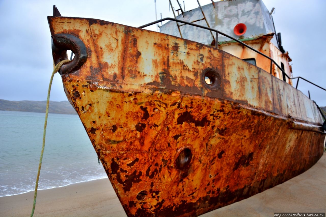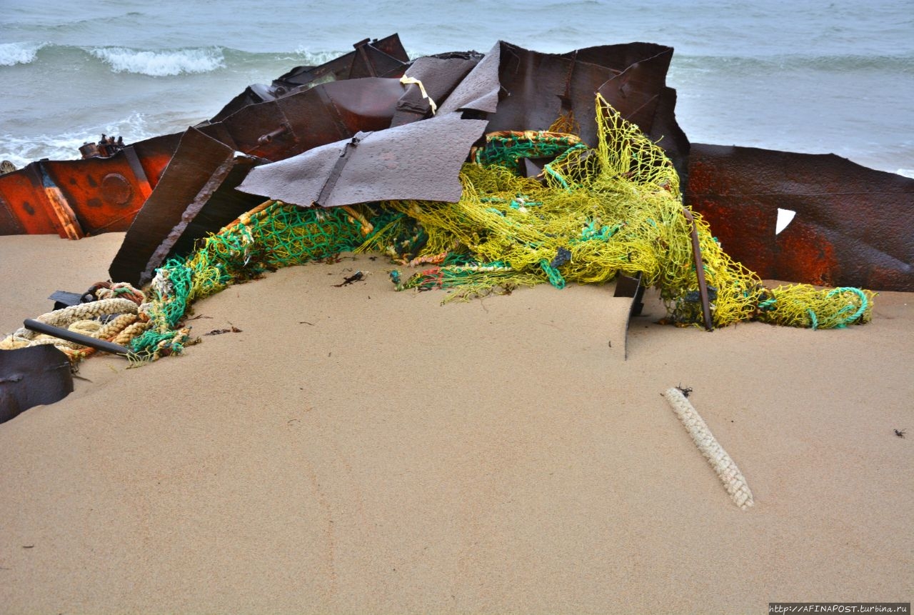 Даже в таком состоянии, корабль не упал набок, а стоит словно у причала, только вместо воды — песок. Словно внутренности убитого зверя, вокруг корабля, распятого людьми, валяются канаты, сети, металлические двери и прочие рыбацкие снасти.
