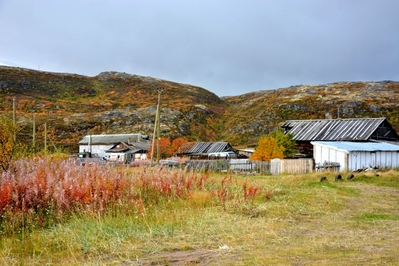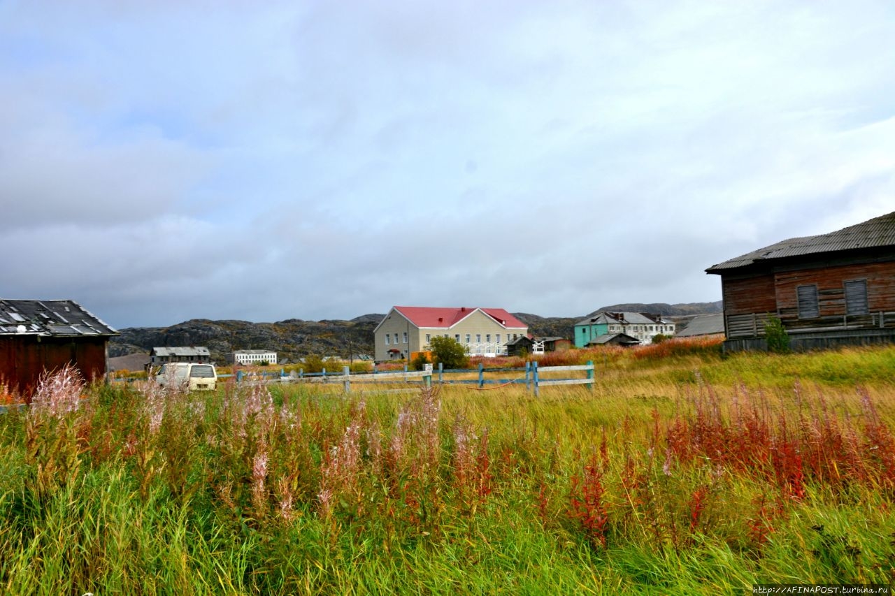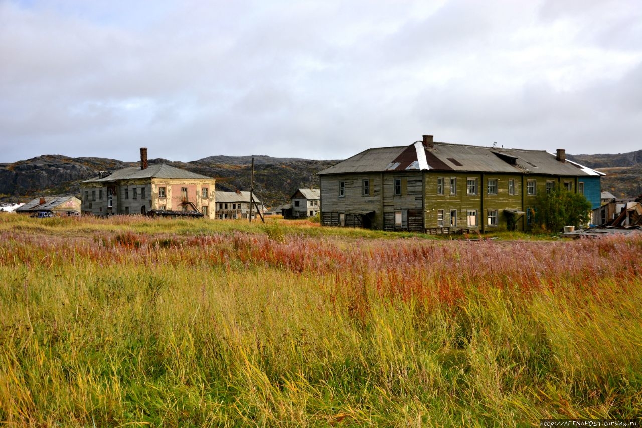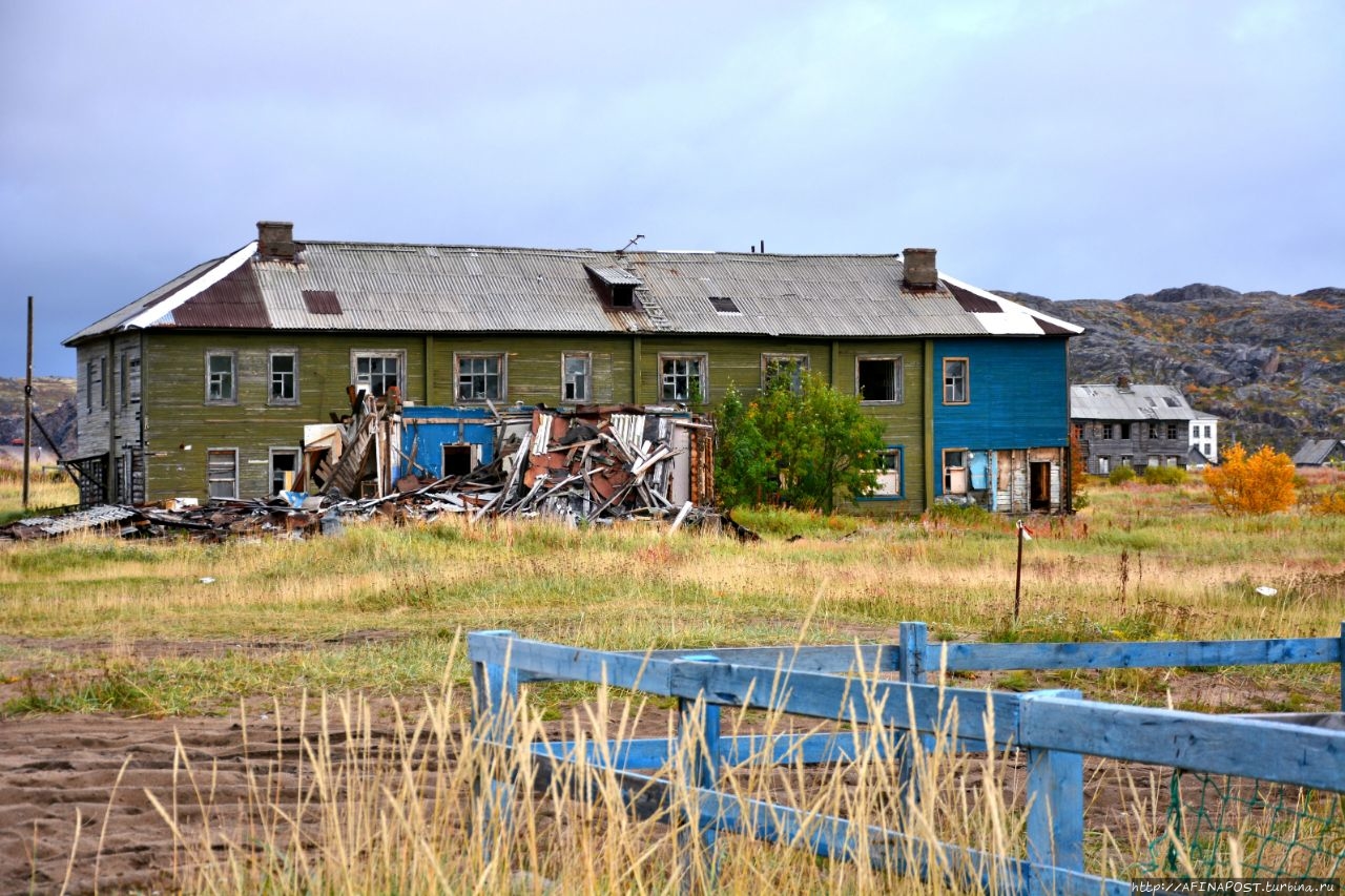 Двухэтажные деревянные бараки давно превратились в заброшки, кроме них, стоят разрушенные сараи-избушки, а перекошенные деревянные гаражи для лодок и катеров, давно потерявшие свою актуальность, портят вид берега залива и реки Териберки. Почему из не разбирают на дрова не понятно, всё — это уныло и негативно. Везде здесь царят упадок и разрушение.