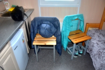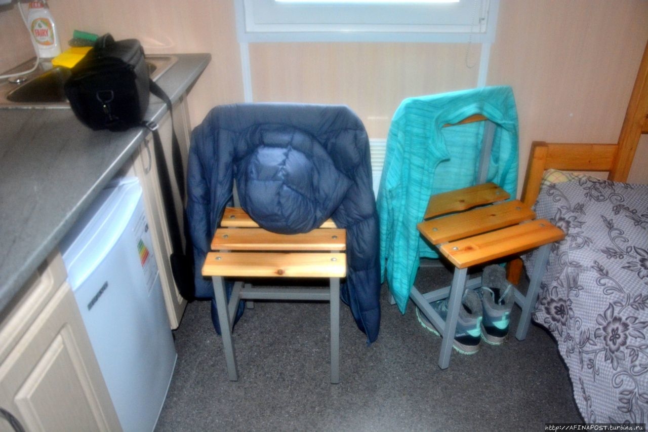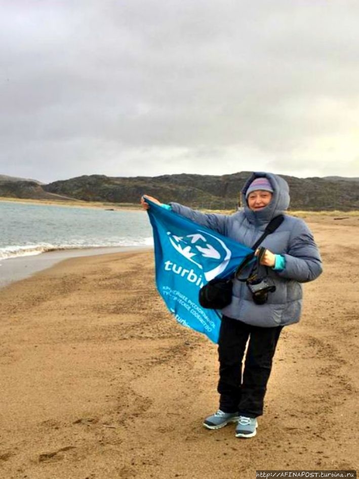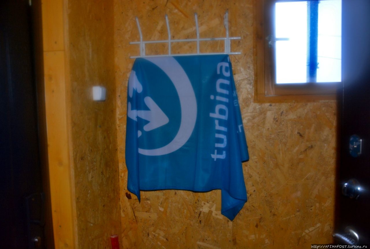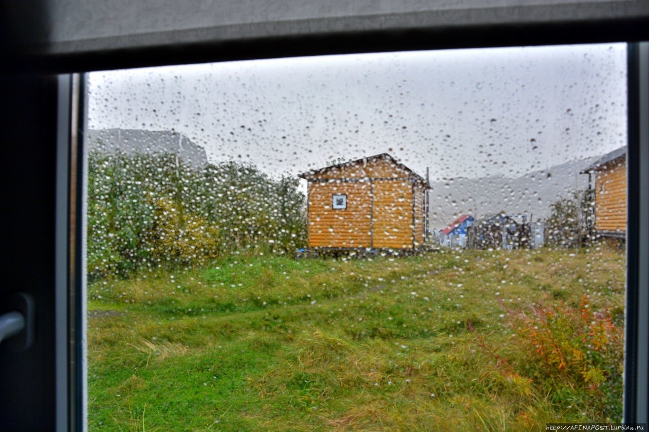 Сильный дождь накрыл нас стеной. Пока показались домики нашей турбазы "Териберка-тур", мы успели вымокнуть насквозь. Флаг Турбины хотел спасти мой пуховик и преданно лёг мне на плечи, но ливень был беспощаден!