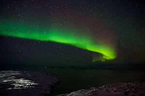 Прошло двое суток, но северное сияние не спешило раскрыть свои секреты. И только в последнюю ночь, изрядно поиздевавшись над нами, оно зажглось над Баренцевом морем. Не такое сильное, как обещали прогнозы, но нам хватило и этого. Матрицы наших камер с огромным энтузиазмом всасывали космический свет преобразовывая его в электронные файлы. Не смотря на холод, снимали в плоть до последней вспышки на небе. Уже в третьем часу добрались до чая и приготовились спать, но в небе вновь появился уже знакомый свет. Пришлось снова напяливать сто одёжек и выходить в космическое пространство. Умотались жутко. Три ночи практически без сна, но зато теперь есть новый опыт и соображения, как в следующем сезоне и где, ловить это загадочное и невероятно красивое северное сияние.