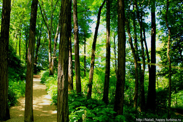 Также ландшафтные дизайнеры изобразили тринадцать инсталляций, по заверению волшебницы, древнегреческих мифов. Сколько мы ни бродили, обнаружить нам удалось только одну — веревка натянутая по верхушкам деревьев изображала нить клубка Ариадны.