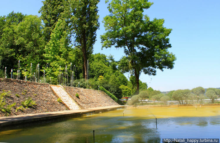 Водный сад оказался несколькими фонтанчиками и двумя водопадами, стекающими по ступенькам. Самое интересное в этом мини-водоеме то, что от него отходят десятки маленьких каналов, из которых орошается весь парк.