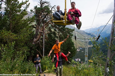 Чегет — гора горнолыжная и в какой-то момент наша тропинка пересеклась с первой очередью кресельного подъёмника. Вот тут наш друг бельгиец Франц и предложил "поиграть".