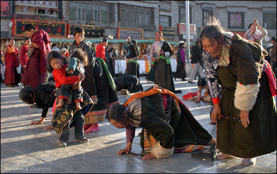 Помимо туристов в Лхасу круглогодично стекаются многочисленные паломники со всех провинций Тибета, особенно в канун праздника Сагадава — традиционного буддийского праздника в честь рождения, просветления и ухода в паринирвану Гаутамы Будды. Гордые длинноволосые воины Кхама, дикие кочевники из Западного Тибета, женщины в украшениях из больших кусков коралла и бирюзы, которую до сих пор можно подобрать прямо с земли в горных районах. Многие из них приходят в Лхасу пешком, а некоторые, самые крепкие в вере, совершая «простирания» — молитвенные поклоны на каждый третий шаг. Эти ползущие «личинки» удивляют больше всего.