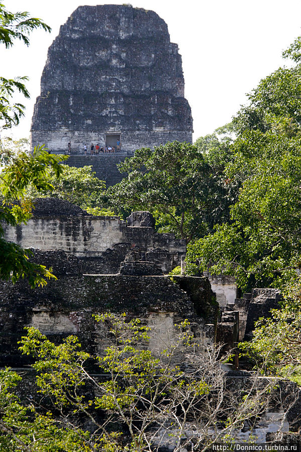 На Храм III тоже подняться нельзя, а вот на Храм IV, самый высокий высотой 70 метров, можно. Вот он здесь виден издалека сквозь джунгли.