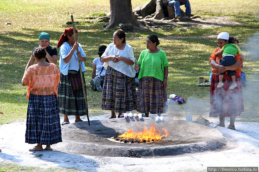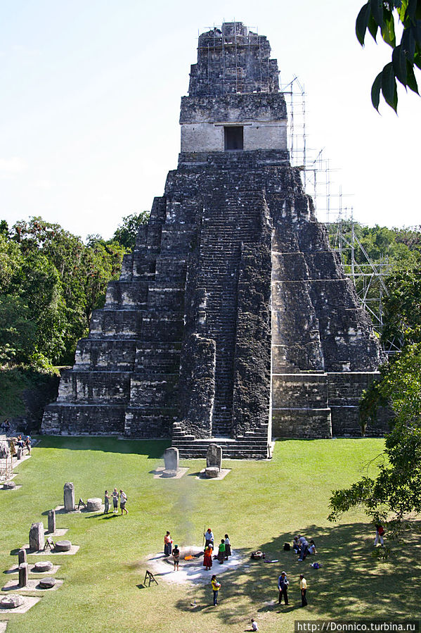 Эта прямоугольная церемониальная площадь ограничена с восточной и западной стороны двумя храмами-пирамидами, а с северной и южной — дворцовыми комплексами. В центре довольно много пространства, которое современные майя часто используют для проведения больших и малых церемоний. Как раз когда мы рассматривали площадь, забравшись на одну из построек дворцового комплекса, они развели огонь и явно готовились к одной из таких церемоний.