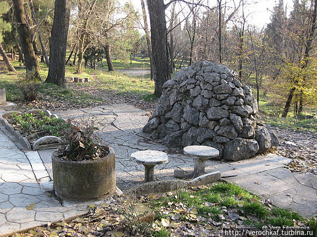 Больше всего распространены в парке пенечки, организованные по 5 штук (4 стула и стол) для игры в нарды, но встречаются и каменные стульчики.<