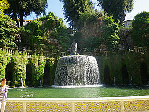 Струи воды на трех уровнях вырываются из земли и открытых ртов маскаронов изображающих лица персонажей поэмы Овидия "Метаморфозы". Всё течёт, всё меняется, только неизменна красота фонтанов Виллы д’Эсте, охраняемых орлами — геральдическими символами семьи первых владельцев парка.Вскоре аллея Ста Фонтанов привела меня к ещё одному шедевру, фонтану Рометта,