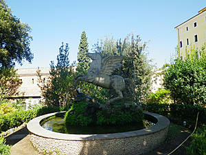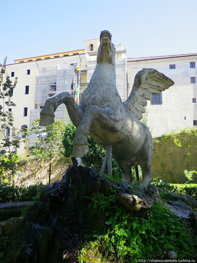 передо мной открывался фонтан Драконов, созданный по преданию за одну ночь в честь посещения виллы Папой Григорием XIII, фамильный герб которого украшали эти сказочные животные. Находясь на центральной оси парка фонтан является главной доминантой всего паркового ансамбля. Сильные струи воды, падая с высоты на крылья драконов разбиваются в мелкие брызги окутывая весь фонтан облаком сверкающих бриллиантов. Невозможно без восхищения смотреть на этот чудесный фонтан и только маленькие дельфинчики установленные в чаше фонтана спокойно разглядывают посетителей.Спускаясь всё ниже и ниже