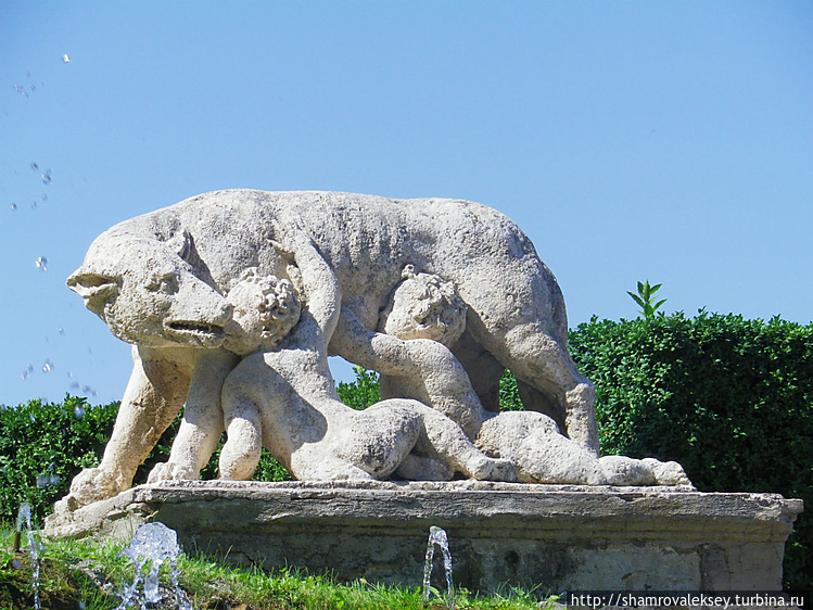 маленькому Риму расположившемуся на одной из сторон парка. В первоначальном состоянии этот фонтан имел множество украшений символизирующих главные архитектурные доминанты Вечного города, к сожалению за долгое время многие из них были безвозвратно утрачены. Сейчас это фонтан украшают скульптуры Божественной Ромы, и волчицы кормящей младенцев, основателей города, а также корабль символизирующий острова среди вод Тибра на которых и был основана столица Италии.Спустившись ниже на один уровень я оказался около фонтана Совы,