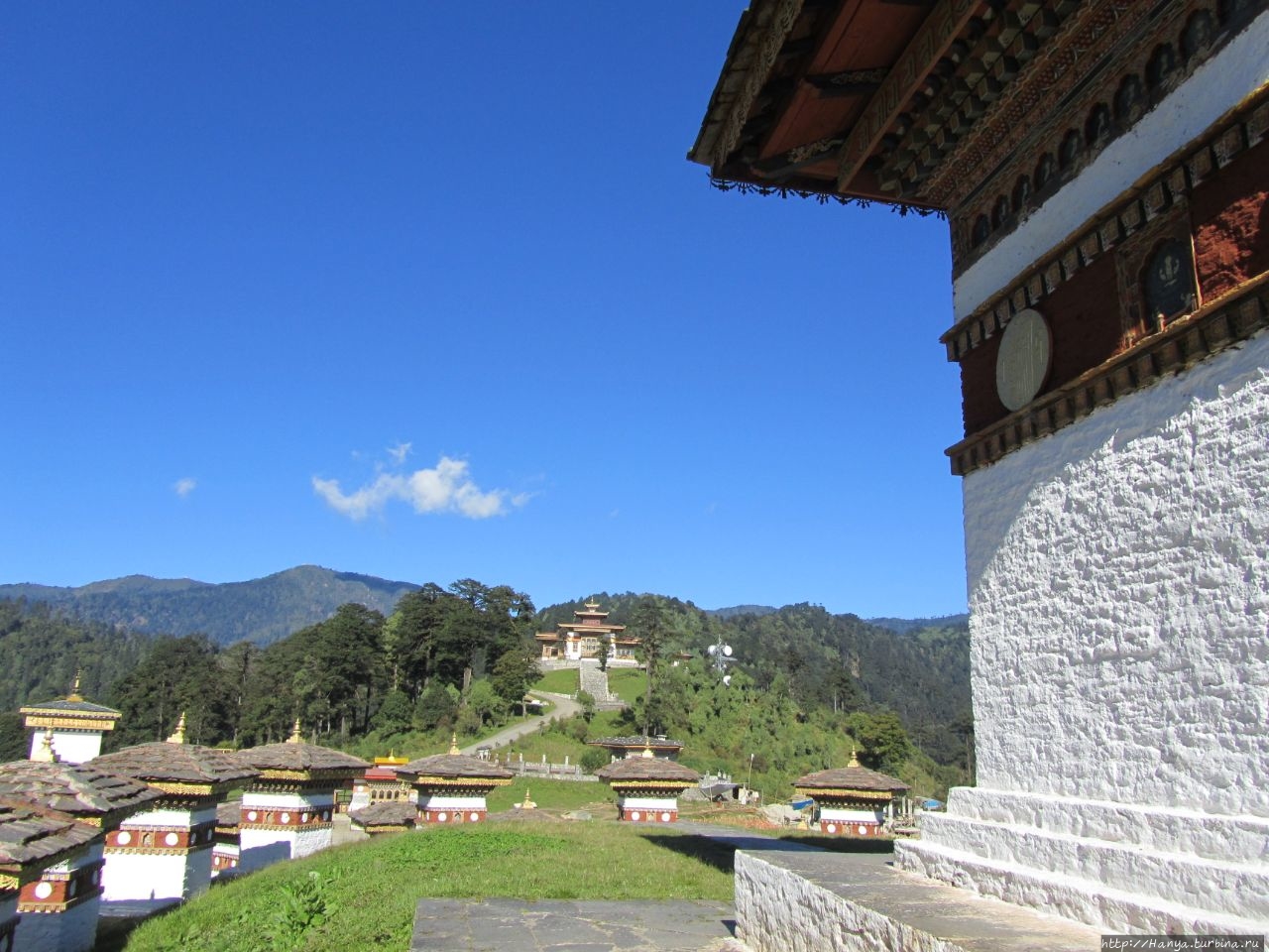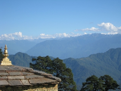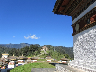 Здесь чувствуется забота бутанцев о своем героическом прошлом: чисто, аккуратно и ухожено. Ощутимо чувствуется высота, дует ветер и конкретно холодно, даже изморозь на траве. День как по заказу, солнечный и безоблачный, и нам повезло полюбоваться панорамой бутанских Гималаев, за которыми уже загадочный Тибет. Место для мемориала выбрано правильное: здесь наряду с данью памяти погибшим, можно и просто полюбоваться волшебным зрелищем гор, ущелий и долин.