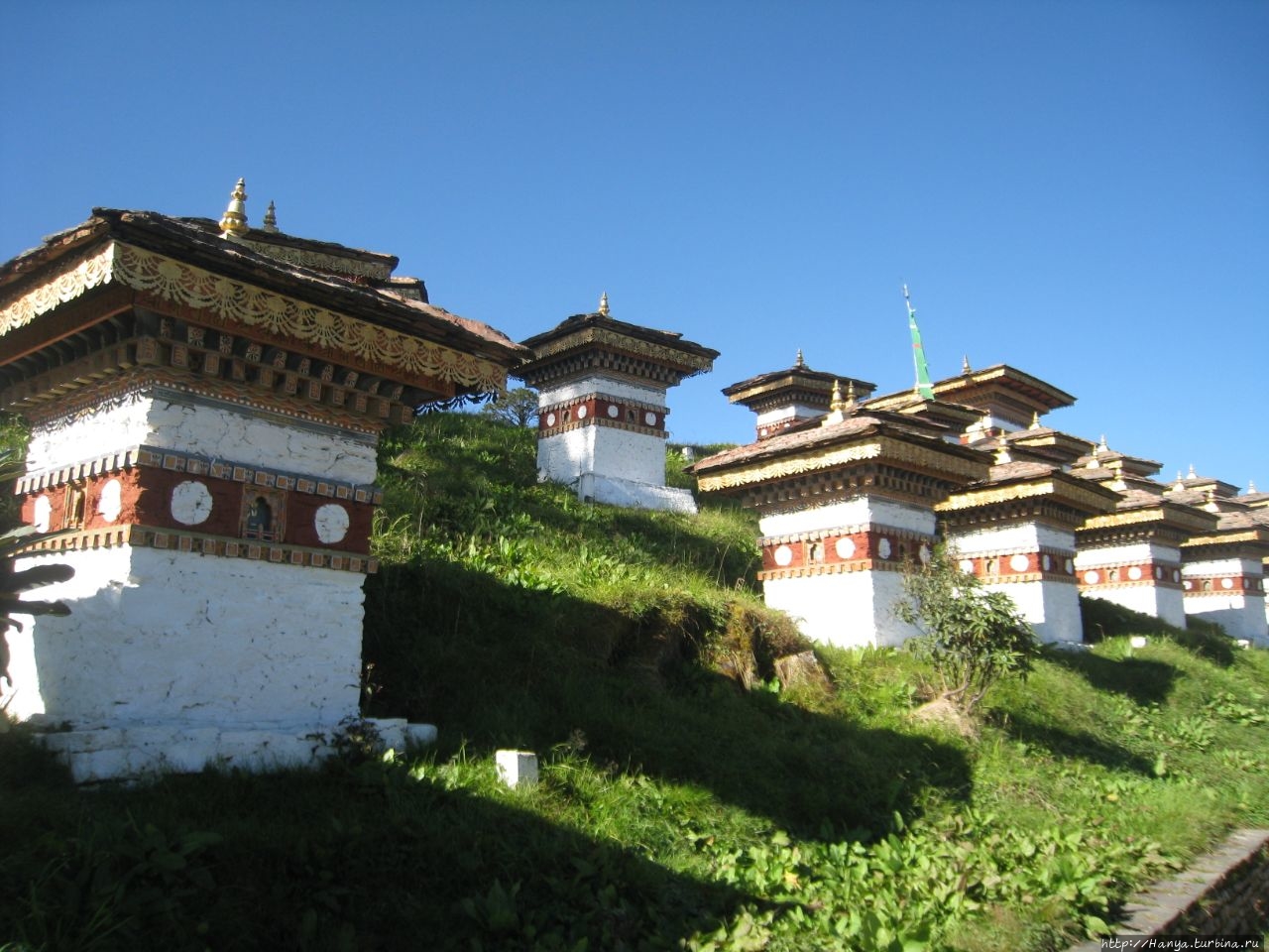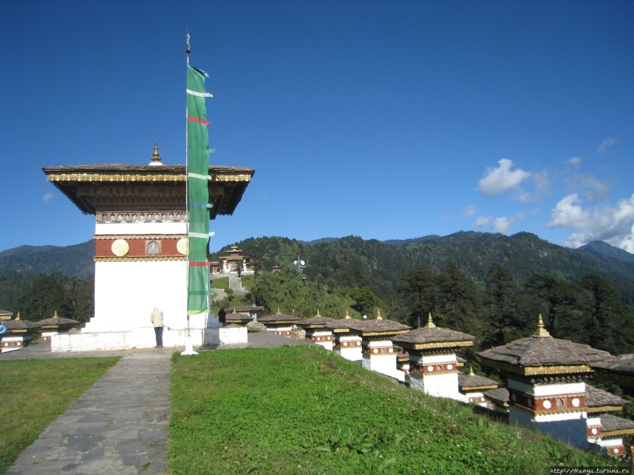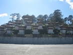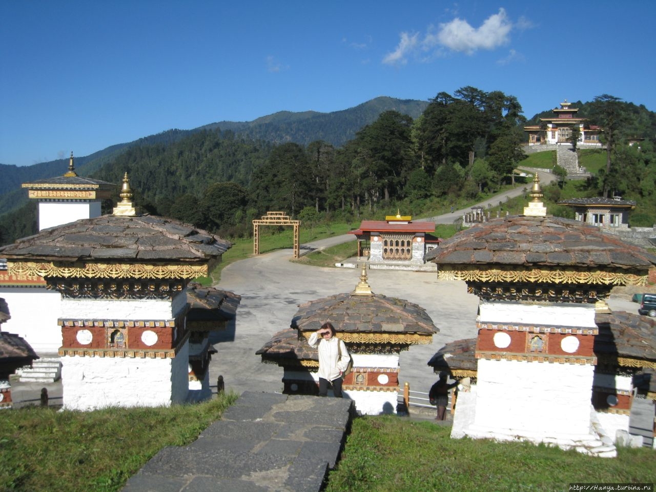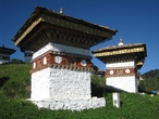 Наконец, через час мы взбираемся на высоту, и останавливаемся на вершине перевала возле монумента, состоящего из 108 чортенов. Они расположены на островке безопасности, кольцами, накинутыми на холм в три этажа. Посредине, завершая конструкцию, стоит один большой чортен-пагода. Вся эта конструкция была возведена здесь в 2003 году в честь победы армии Бутана над индийскими террористами, сбежавшими из своей страны и нашедшими приют в джунглях Бутана, недалеко от границы с Индией. С территории чужой страны хорошо вооруженные «боевики» Ассамского сопротивления продолжали вылазки на Родину, осуществляя взрывы и убийства.