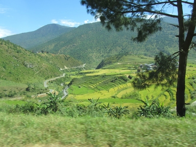 Дорога идет вниз, и через деревья уже видна восхитительная картина долины реки Punak Tsang Chhu, впадающая в Брахмапутру в штате Ассам в Индии. Эта долина уже находится на высоте 1250 метров и здесь стоит остановиться, чтобы полюбоваться бархатными рисовыми полями-террасами.