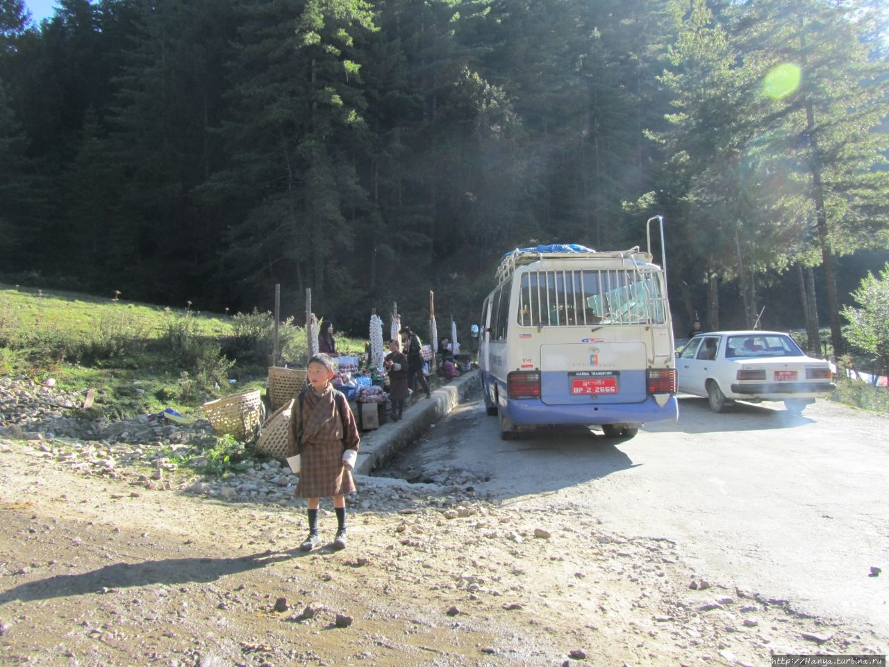Я уже говорила, что туризм в Бутане ограничен (кроме определенной суммы в день еще есть и определенная квота для посещения иностранцев), доступна для посещения небольшая территория страны, и за этим жестко следят путем выдачи пермитов (допусков) для посещения. А чтобы проследить за исполнением этих разрешений, и исключить всевозможные отклонения от предписанного маршрута, на дорогах устроены чек-поинты, первый из которых мы встречаем в деревне Hongtsho. Мы проехали 23 км, и все они шли через яблоневые сады и леса с голубыми соснами. Здешний иммиграционный контрольно-пропускной пункт на высоте 2890 м контролирует въезд в восточный Бутан, и все туристы должны иметь пресловутый строго-регламентированный пермит. Тандин идет к небольшому домику и отмечает его, а мы выходим из машины, чтобы прицениться к яблокам, которые продают тибетские беженцы, живущие в этом местечке. Яблоки плотно уложены в узкие пакеты по 5 штук, и они имеют темно бордовый цвет. Рядом висят мотки нанизанного на нитки ячьего сыра, и туристы из едущего впереди нас автобуса, покупают его.