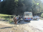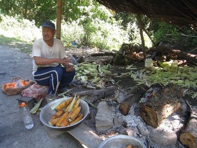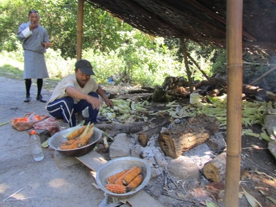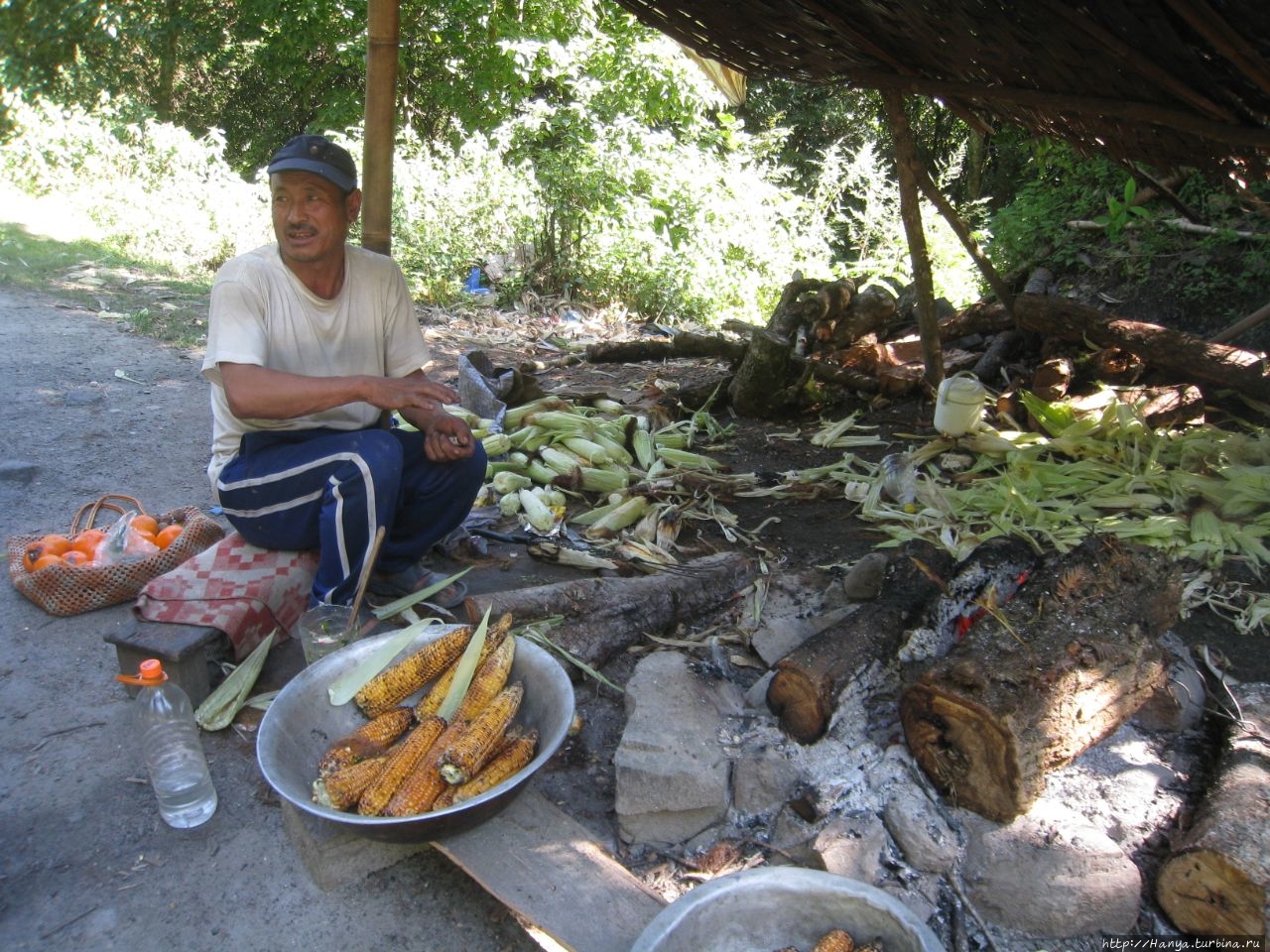 Постоянные виражи, повороты почти на 180 градусов и все вверх, вскоре убаюкали нас, и мы задремали. Проснулись от неожиданной остановки и подумали, что это очередная пробка из-за ремонта. Ан-нет, это местная аттракция – запеченная на углях кукуруза. Тандин захотел ее сам, и решил дать нам продегустировать ее. Выходим, чтобы поразмяться, наш водитель тщательно выбирает початки и передает нам.