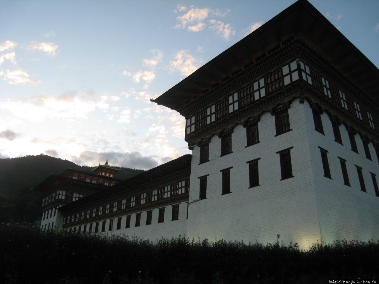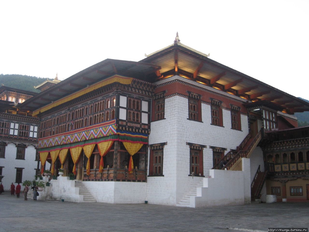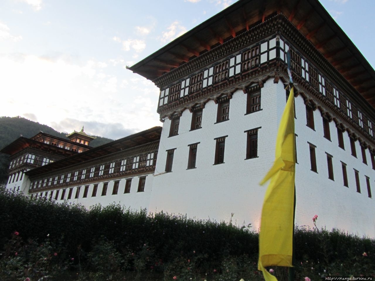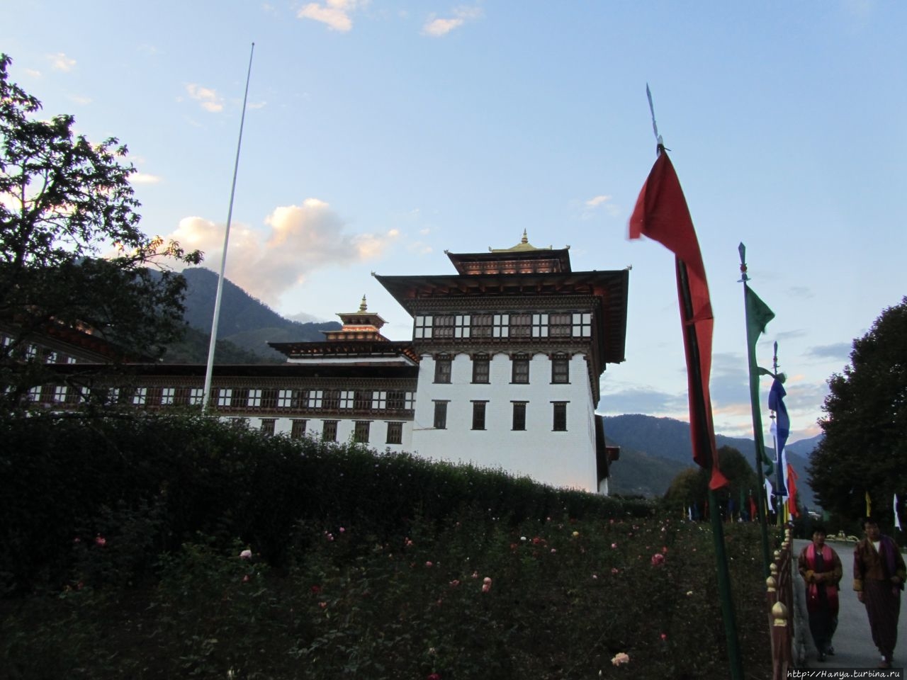 Эта великолепная крепость-дзонг расположена недалеко от города Тхимпху, к его северу, рядом с берегами реки Ванг Чу, на ее западном берегу. Это впечатляюще большое сооружение, окруженное ухоженными газонами и красивыми садами, естественно вписывается в долину, даруя городу царственное великолепие и монашеский стиль. Оказывается и хорошо, что мы приехали сюда в конце дня, именно в это время посетителей допускают внутрь.