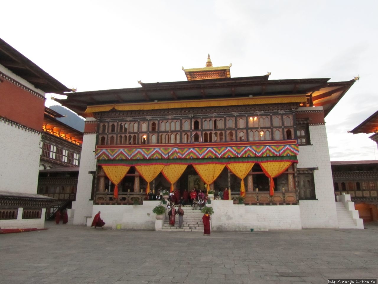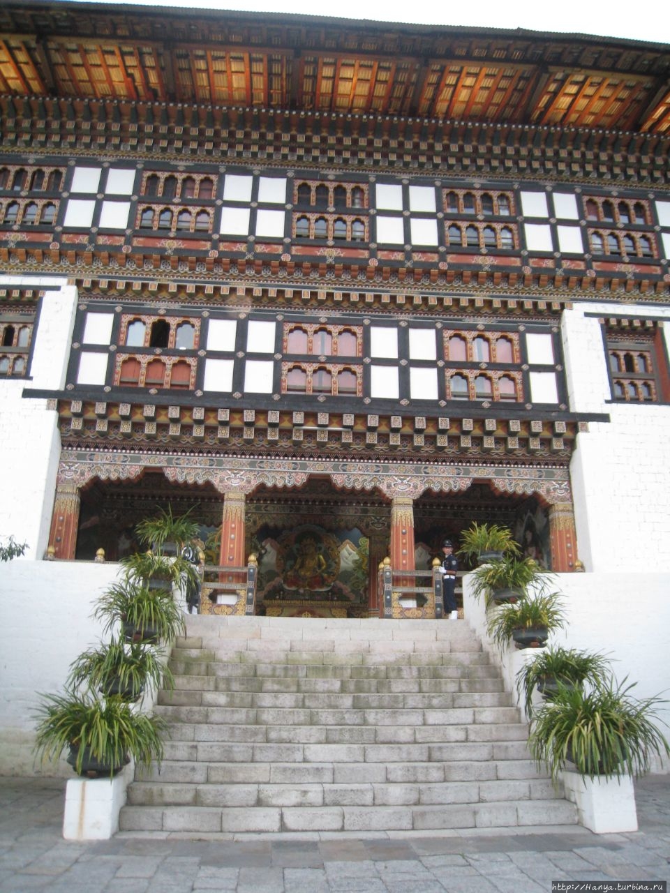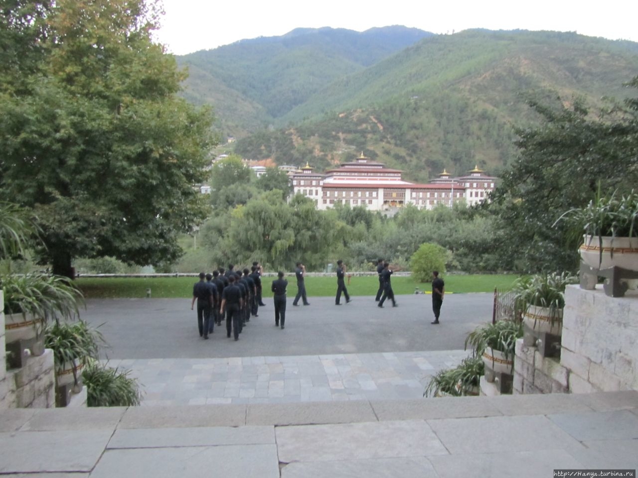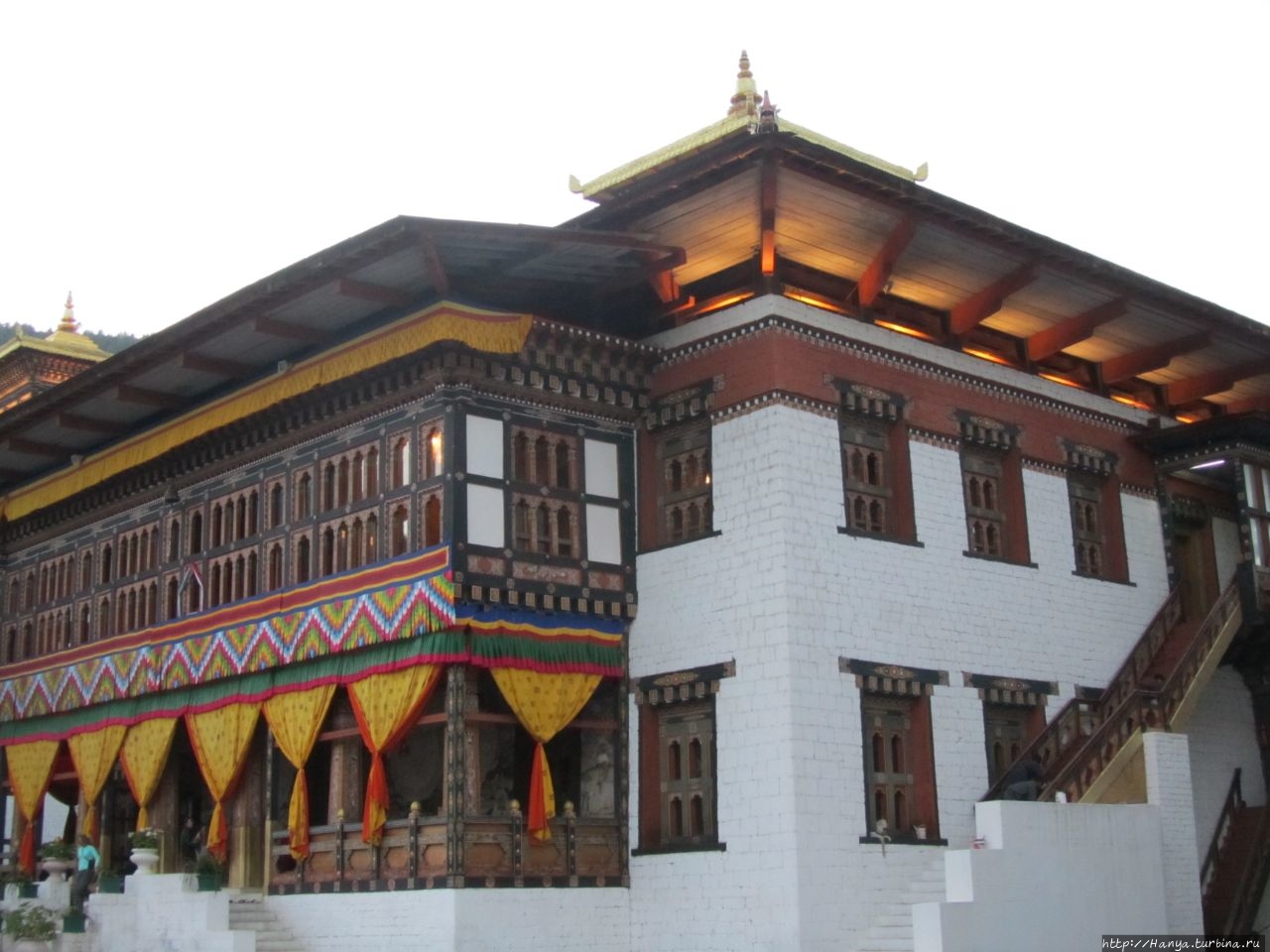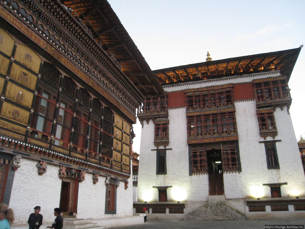 Эта великолепная крепость-дзонг расположена недалеко от города Тхимпху, к его северу, рядом с берегами реки Ванг Чу, на ее западном берегу. Это впечатляюще большое сооружение, окруженное ухоженными газонами и красивыми садами, естественно вписывается в долину, даруя городу царственное великолепие и монашеский стиль. Оказывается и хорошо, что мы приехали сюда в конце дня, именно в это время посетителей допускают внутрь.