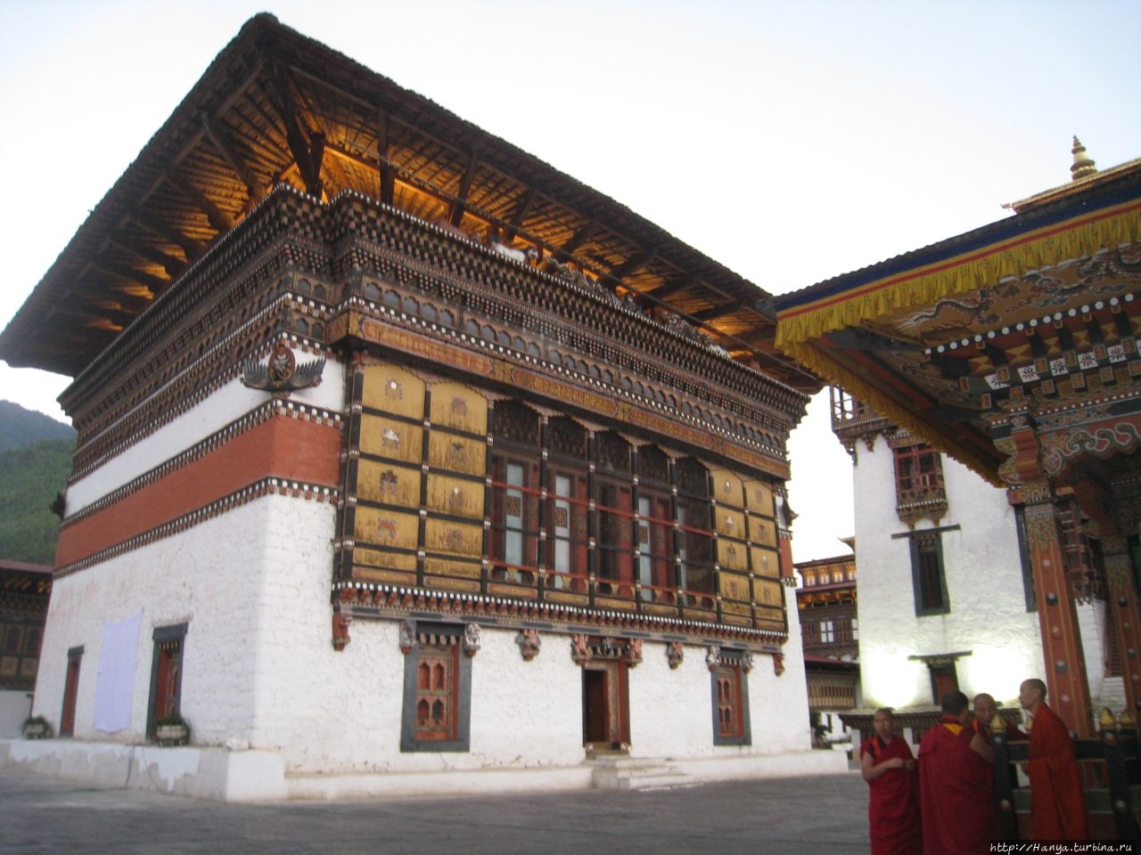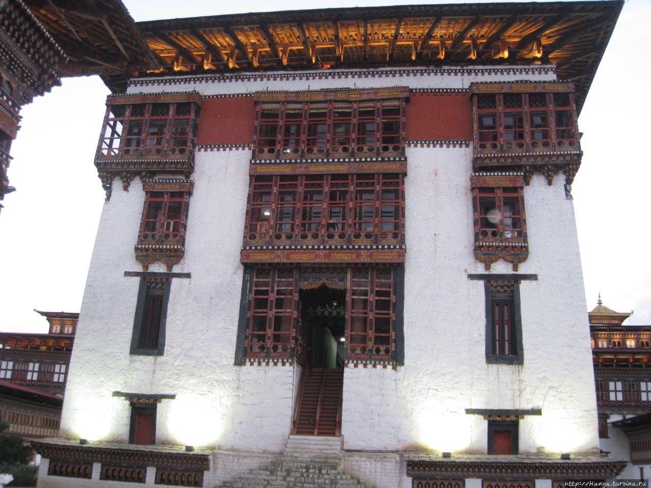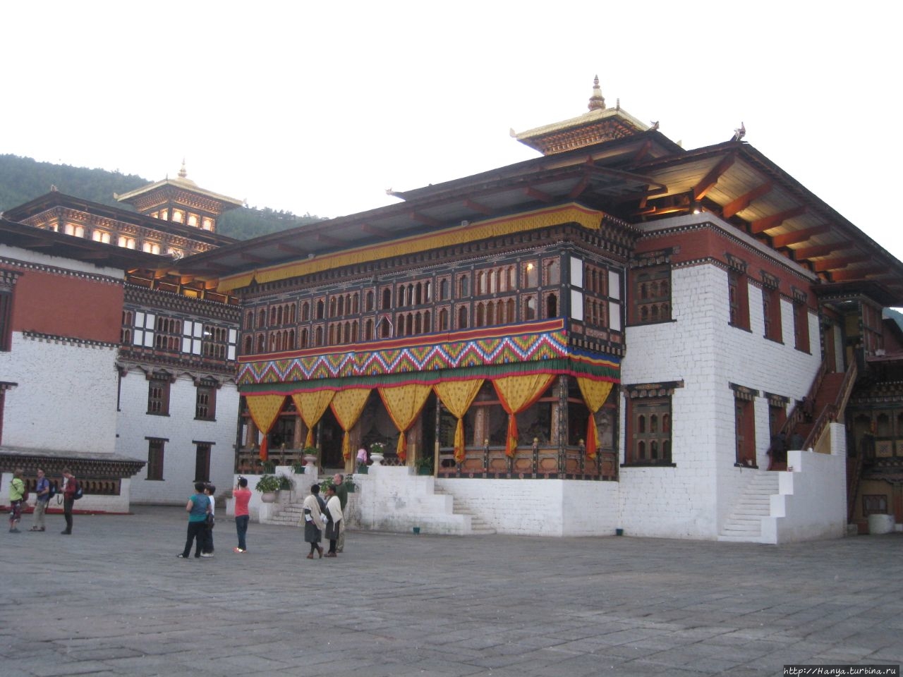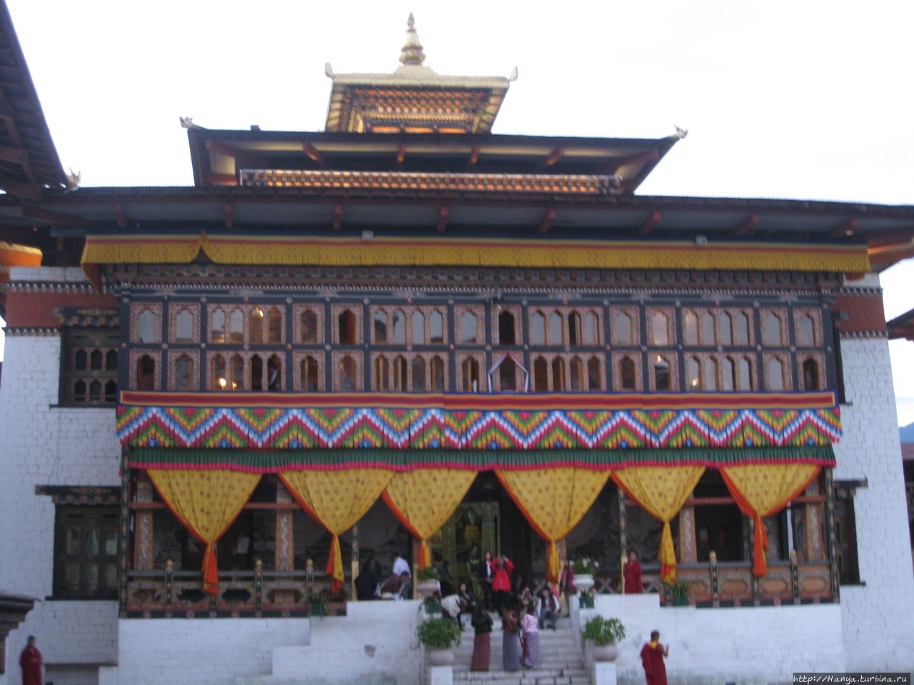 Эта великолепная крепость-дзонг расположена недалеко от города Тхимпху, к его северу, рядом с берегами реки Ванг Чу, на ее западном берегу. Это впечатляюще большое сооружение, окруженное ухоженными газонами и красивыми садами, естественно вписывается в долину, даруя городу царственное великолепие и монашеский стиль. Оказывается и хорошо, что мы приехали сюда в конце дня, именно в это время посетителей допускают внутрь.
