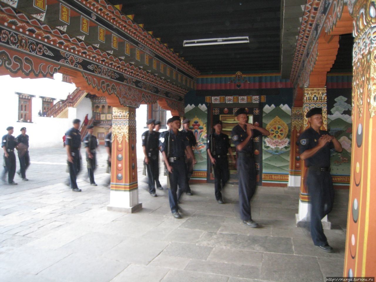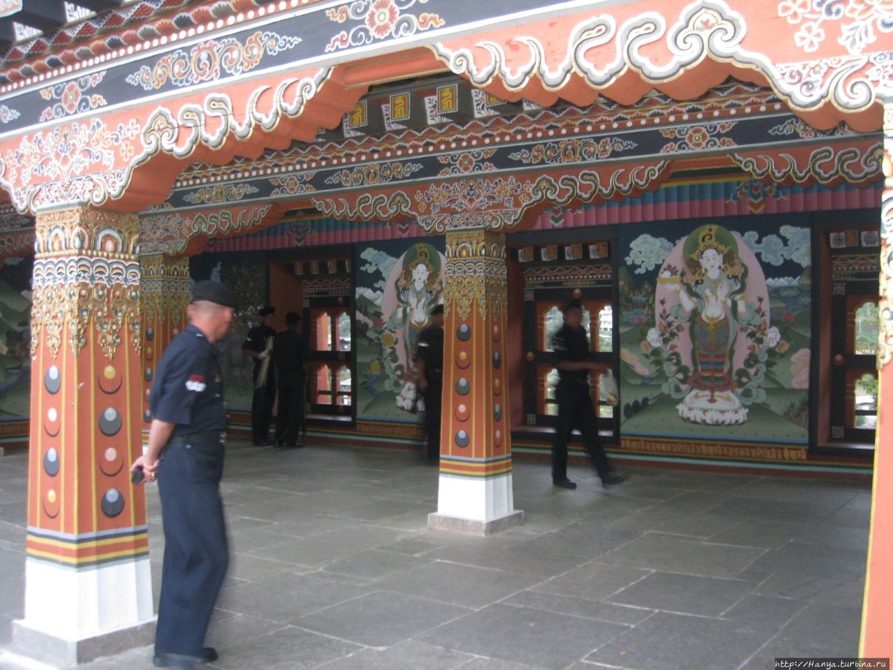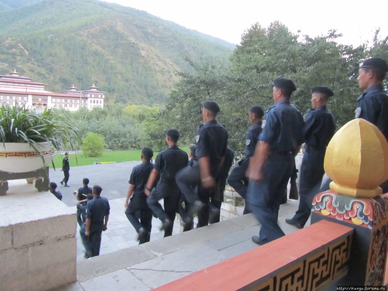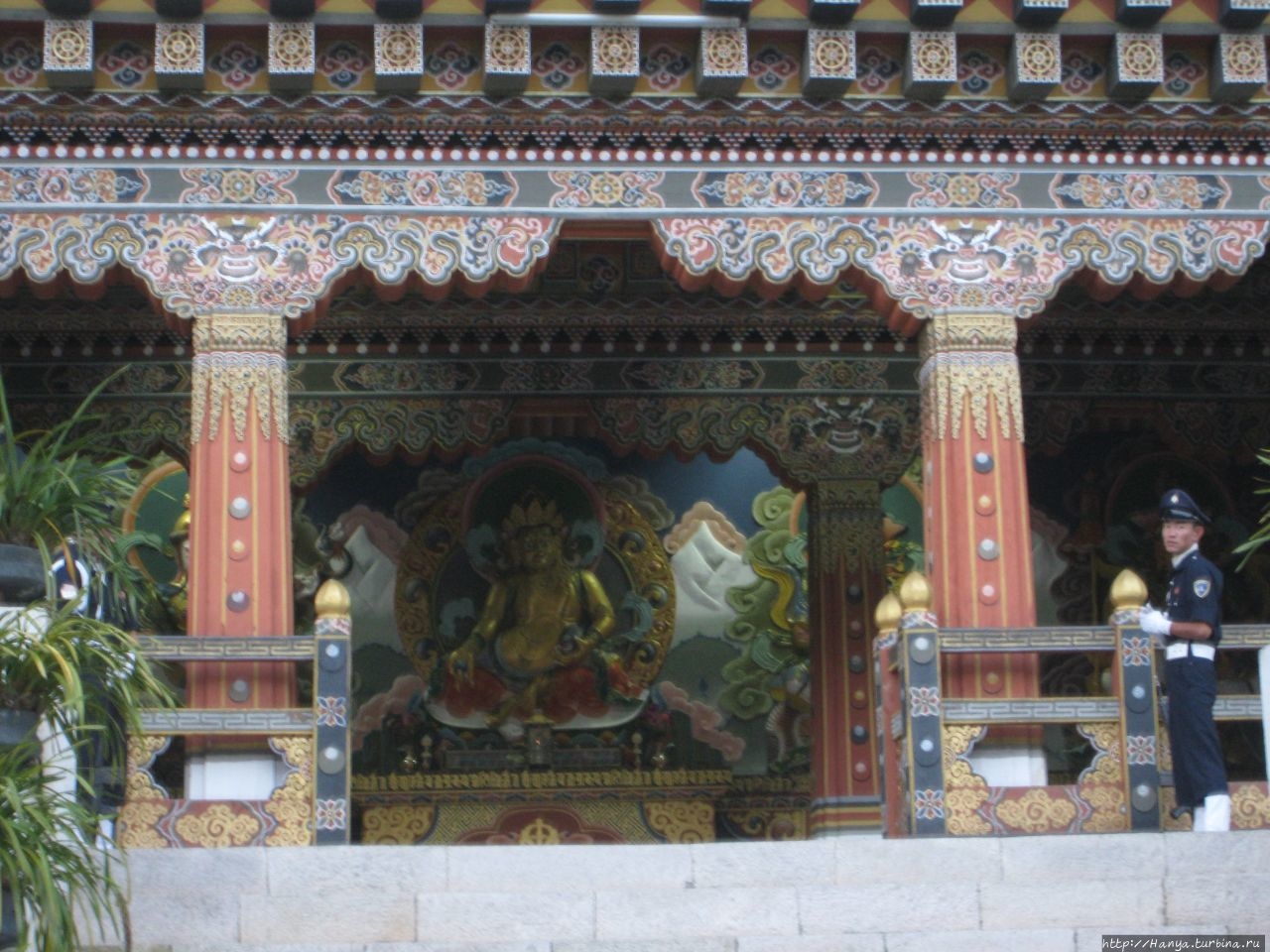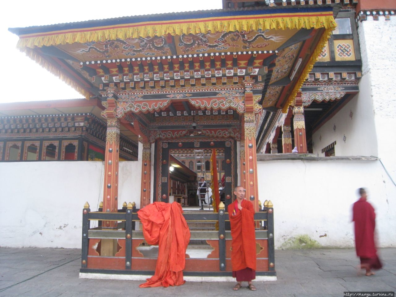 Эта великолепная крепость-дзонг расположена недалеко от города Тхимпху, к его северу, рядом с берегами реки Ванг Чу, на ее западном берегу. Это впечатляюще большое сооружение, окруженное ухоженными газонами и красивыми садами, естественно вписывается в долину, даруя городу царственное великолепие и монашеский стиль. Оказывается и хорошо, что мы приехали сюда в конце дня, именно в это время посетителей допускают внутрь.