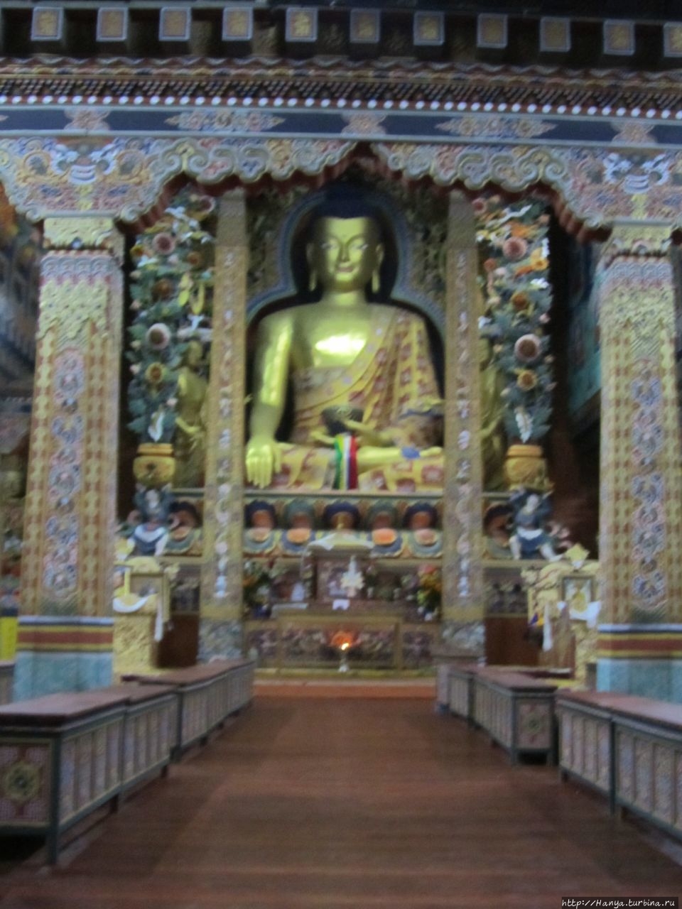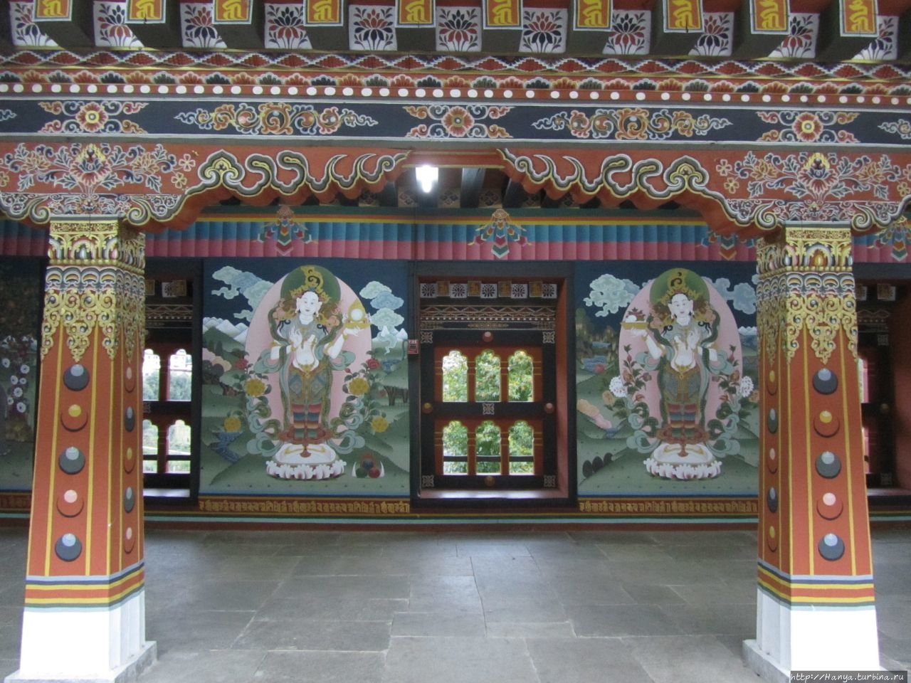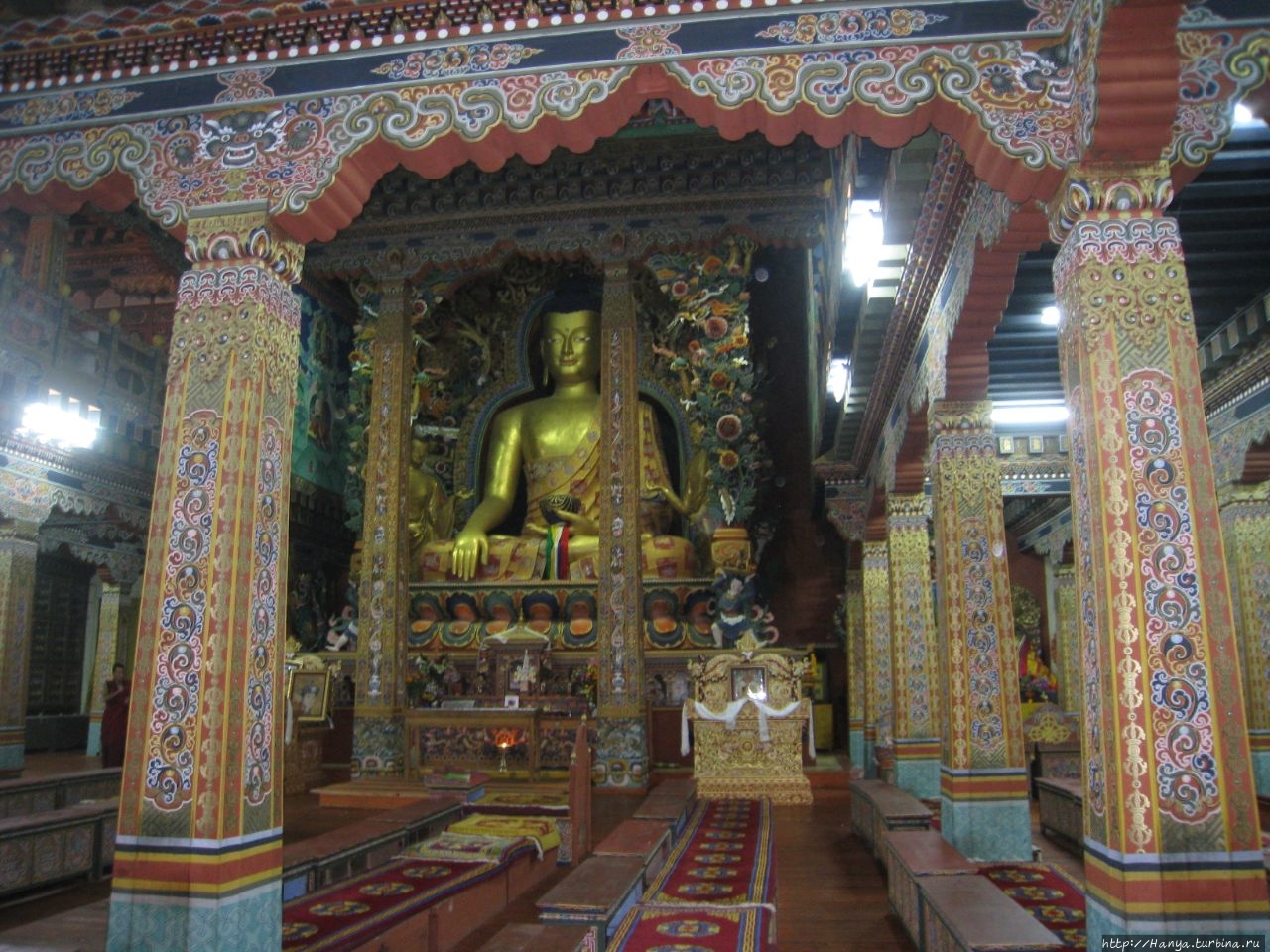 Классическая бутанская архитектура с резными и рисованными фасадами внутри этого дзонга вдруг показалась мне сродни вышивке, ярким пятном акцентированной на белых стенах. Доступ внутрь разрешен только в одно здание, внутри которого красота орнамента усилена в разы. В центре огромного зала – статуя Шакьямуни – Будды настоящего. Здесь же троны бывшего и нынешнего королей, а также верховного духовного лица. Поднимаем головы к потолку, который украшен замысловатой мандалой. Сильно жалеем, что не видели открыток или других изображений в и-нете с незабываемой росписью бутанских храмов.