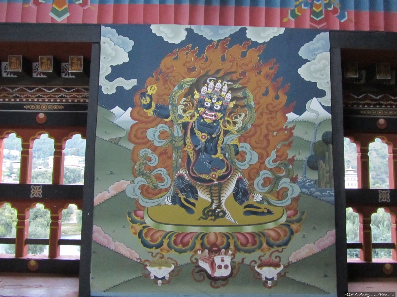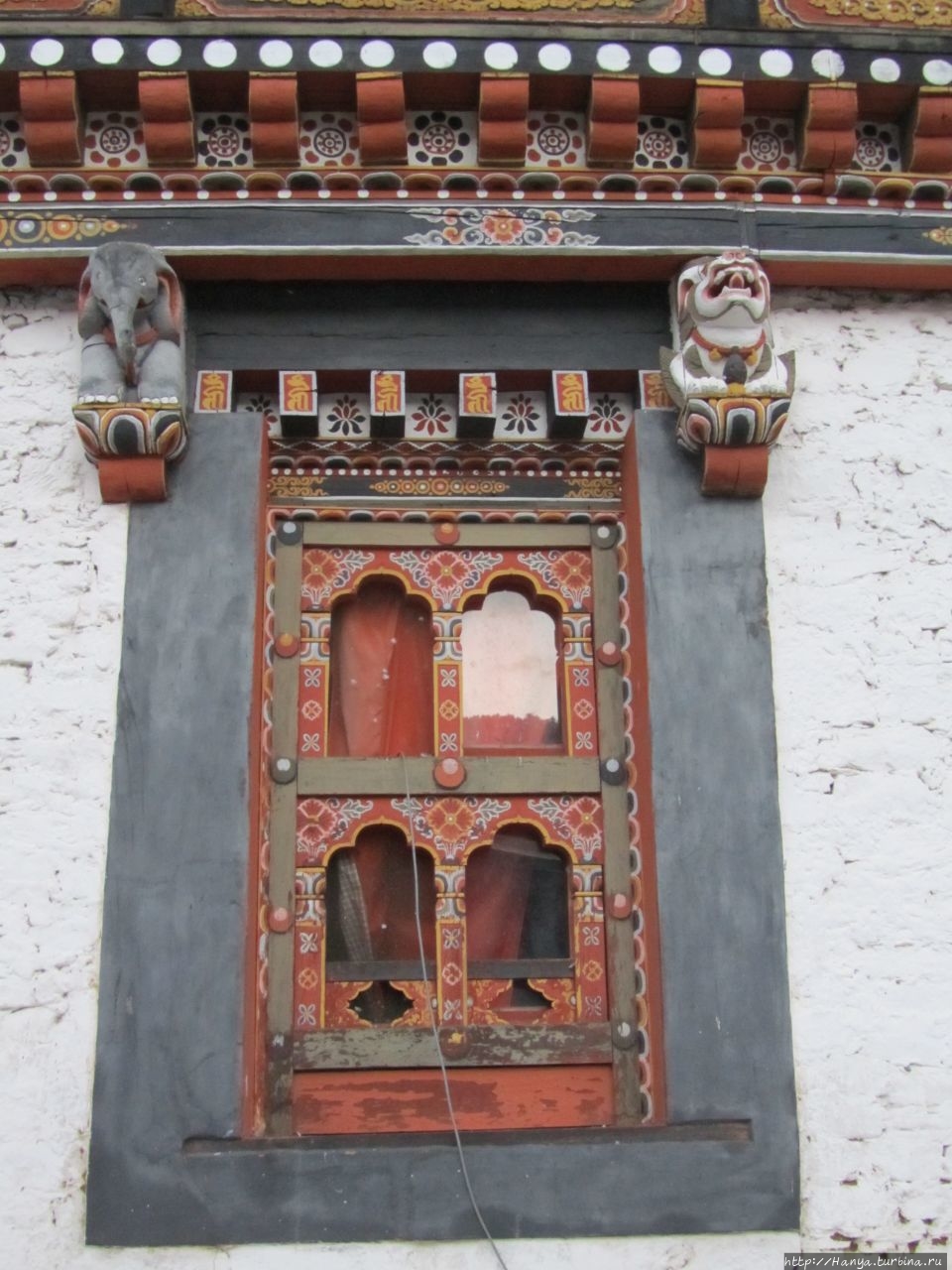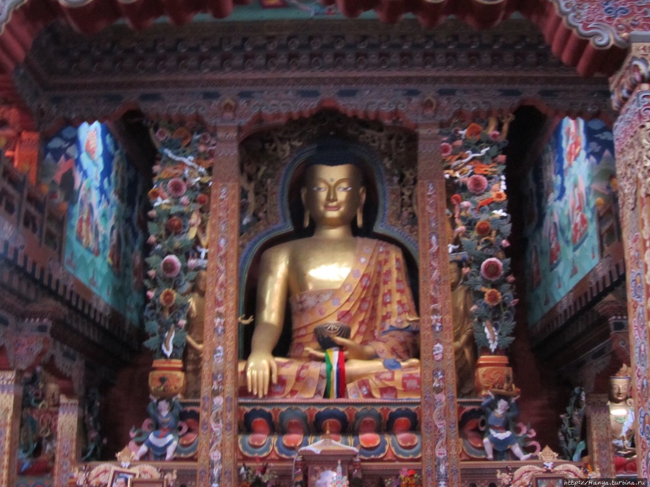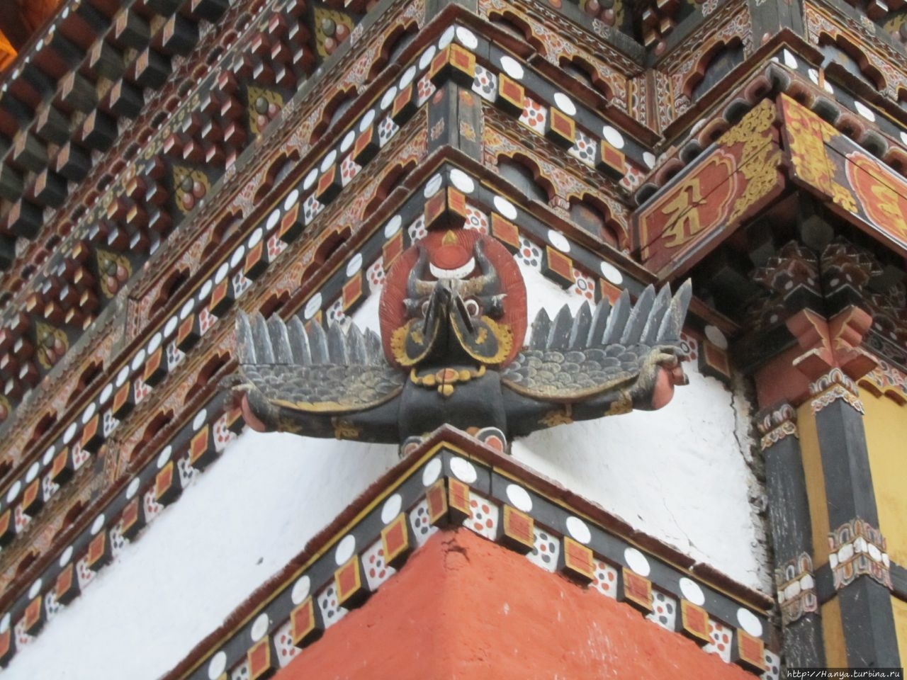 Классическая бутанская архитектура с резными и рисованными фасадами внутри этого дзонга вдруг показалась мне сродни вышивке, ярким пятном акцентированной на белых стенах. Доступ внутрь разрешен только в одно здание, внутри которого красота орнамента усилена в разы. В центре огромного зала – статуя Шакьямуни – Будды настоящего. Здесь же троны бывшего и нынешнего королей, а также верховного духовного лица. Поднимаем головы к потолку, который украшен замысловатой мандалой. Сильно жалеем, что не видели открыток или других изображений в и-нете с незабываемой росписью бутанских храмов.