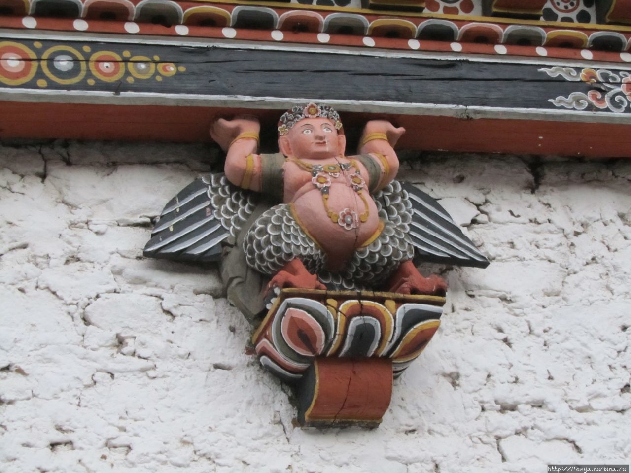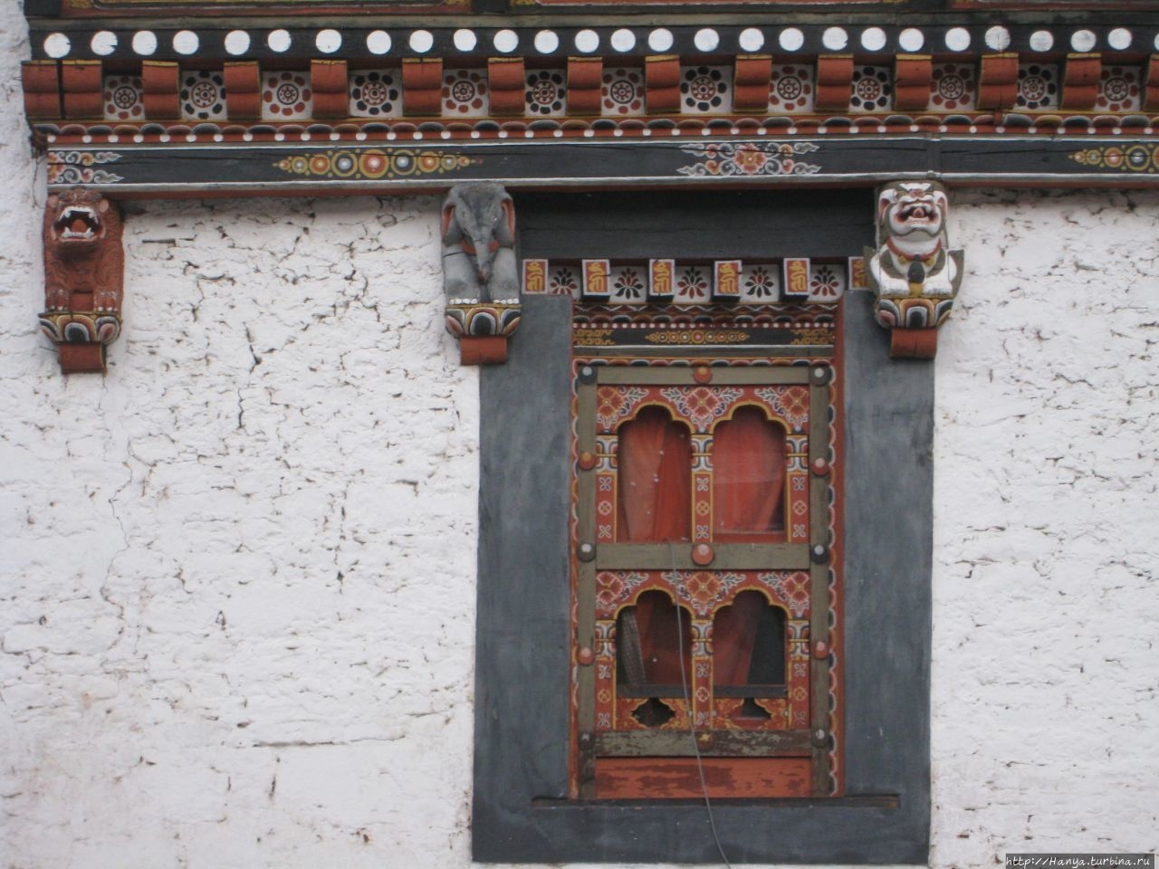 Бродим по двору, переходя от одного угла к другому, чтобы сделать великолепные снимки на фоне сумеречного неба. Одно из зданий на площади, закрытое для доступа, по фасаду украшено атлантами и кариатидами по-бутански. Их роль здесь выполняют слоны, львы, тигры и другие неведомые зверушки. Кроме них, балки балкона поддерживают пузатые толстячки с крыльями.
