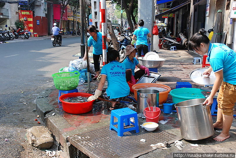 Клиентов подобных точек не смущает, что посуда моется в ведре с мутной водой, а деревянные палочки, которыми положено есть — совсем не одноразовые. Хотя даже в приличном с виду кафе, если подойти к нему со стороны кухни, можно встретить то же самое.