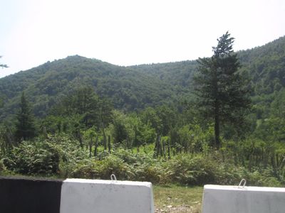 До Ткибули 30 километров, но дорога узкая , горная, скотина гуляет, дети мелкие бегают. Ехать почти час. Дато провез нас через весь город и высадил на повороте на серпантин ведущий к заброшенной канатной дороге.