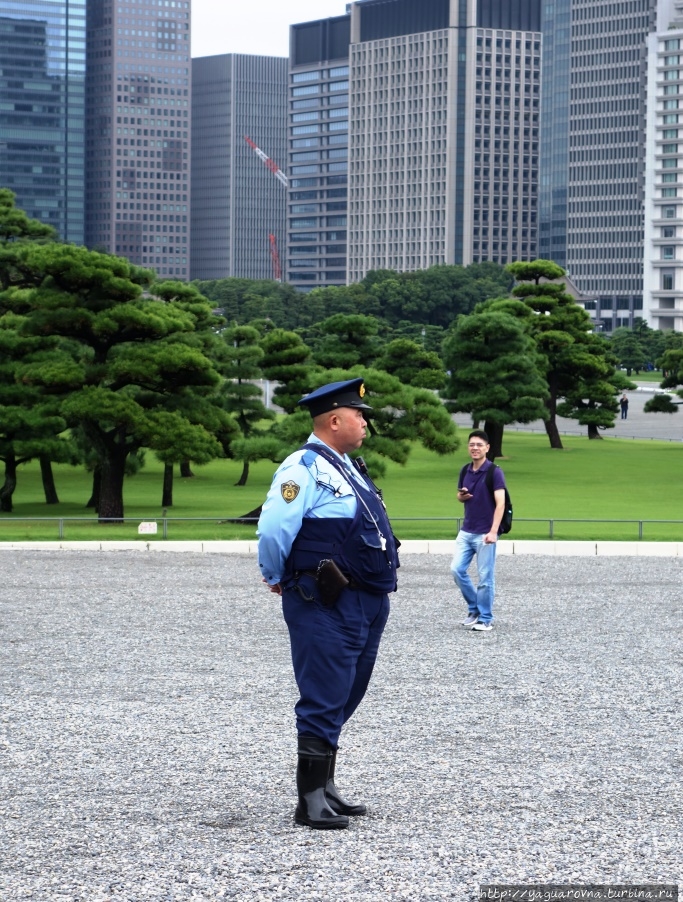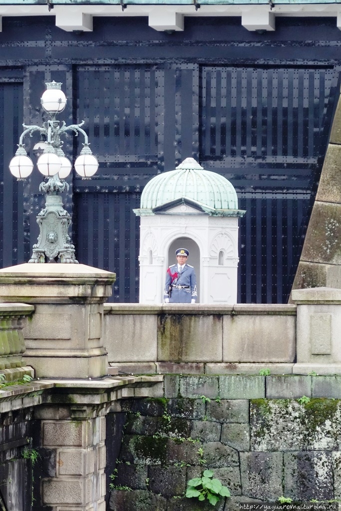 За мной мост, ведущий на территорию дворца, называется он Meganebashi. Буквально — мост-очки, действительно, похоже. Первоначально мост тоже был деревянным, из камня его перестроили во второй половине XIX века, при Мейдзи. К этому мосту под прямым углом ведет еще один мостик. Других гуляющих по нему не было, но я рискнула приблизиться ко входу. Страж не моргнул и глазом, даже когда я щелкнула камерой. Правда, на площади у моста со стороны города нарисовался другой представитель власти.