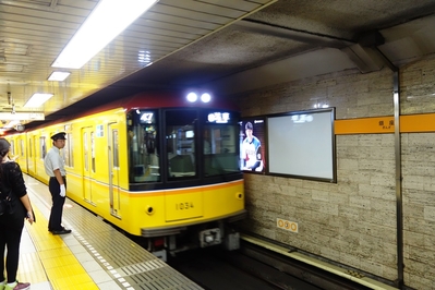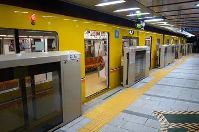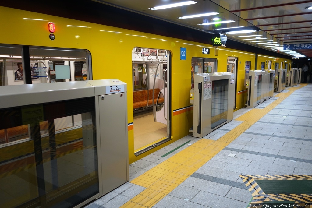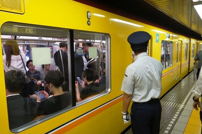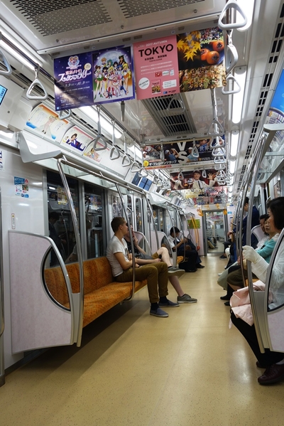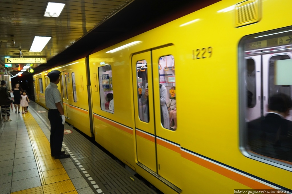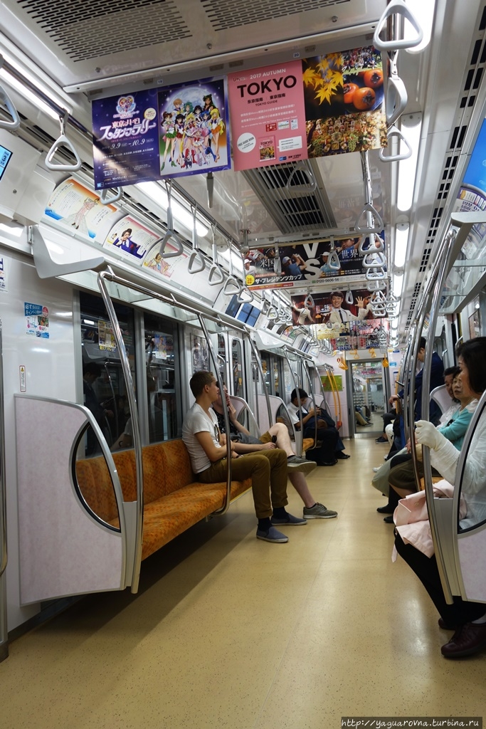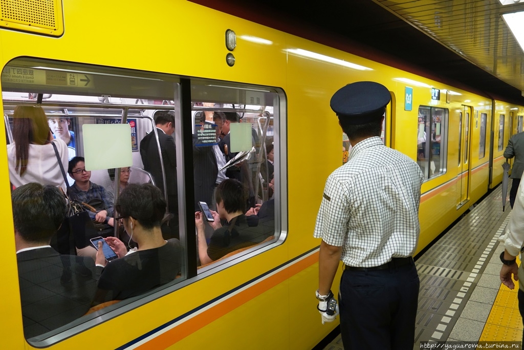 Посадка в вагон — организованный процесс. Известно про наличие в метро Токио должности "заталкивателя в вагоны", но нам такого испытать не довелось, наверное, в удачное время минимальной загрузки ездили. На платформе нарисованы указатели, где будут двери. Люди выстраивались в аккуратные короткие очереди по 2-3 человека, спокойно ждали, когда приехавшие пассажиры выйдут из вагона, после чего заходили сами.