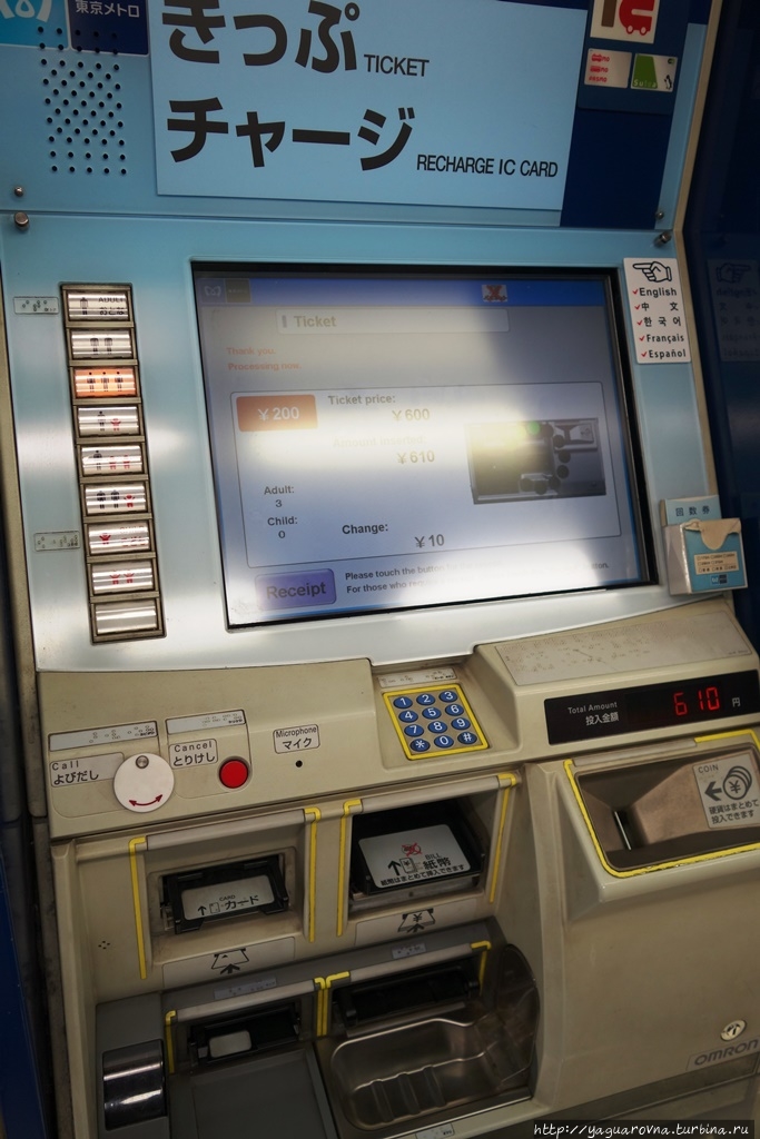 Билеты в метро и на поезда JR продаются в кассах и автоматах. Автоматы быстрее и удобнее и расположены прямо перед турникетами. Над ними висит карта метро с ценами, чаще всего она продублирована на английском. Если на карте нет нужной остановки, то сбоку от терминала на информационном щите будет полный перечень станций со стоимостью проезда.