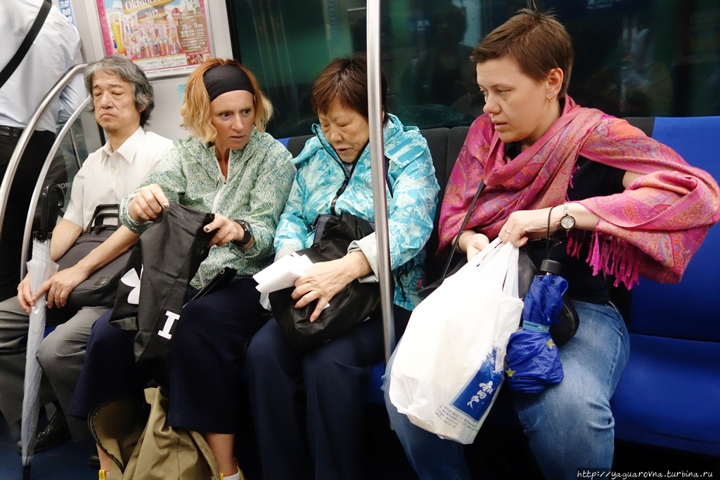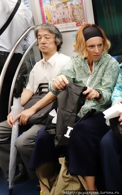 Замечу, что уступать места пассажирам с детьми или инвалидам, или просто так — в душевном порыве, в Токио не принято, так что если сели — сидите спокойно, спяшим или уткнувшимся в книжку притворяться не надо. В часы пик, когда метро работает на пределе, в составах выделяют один вагон только для женщин. На нём так и написано: "Women only".