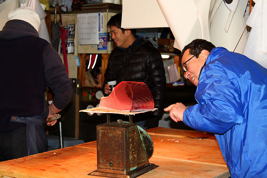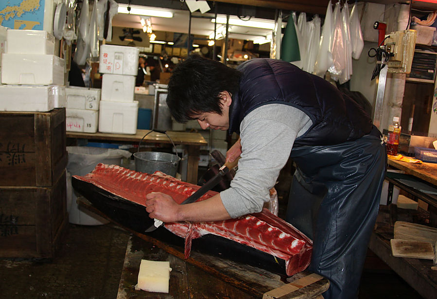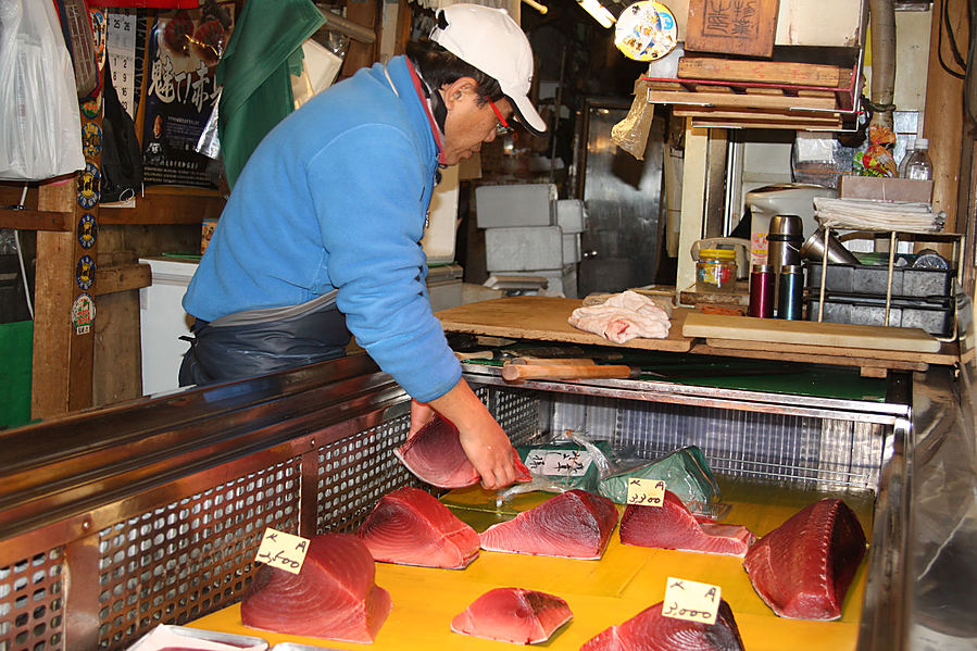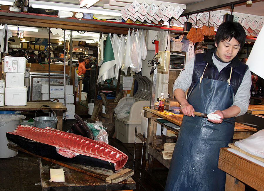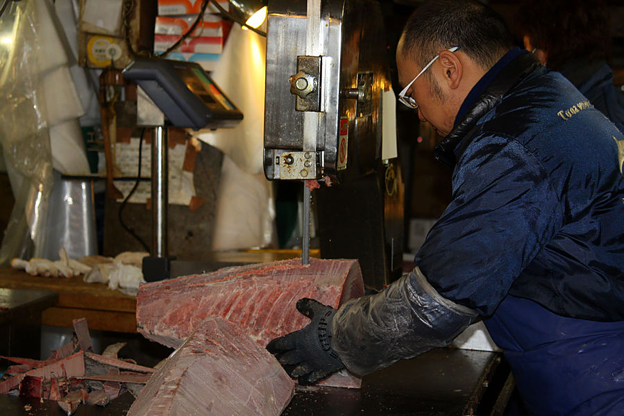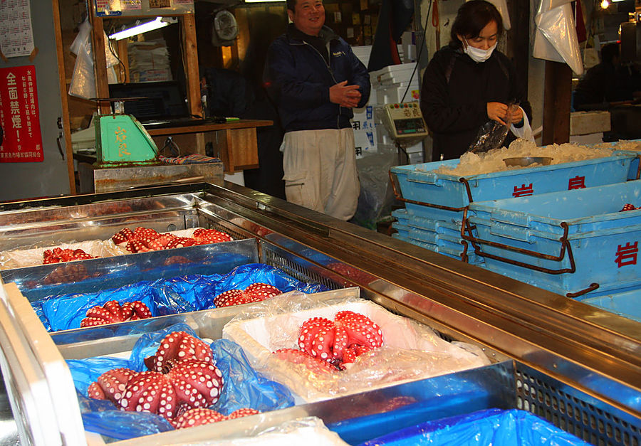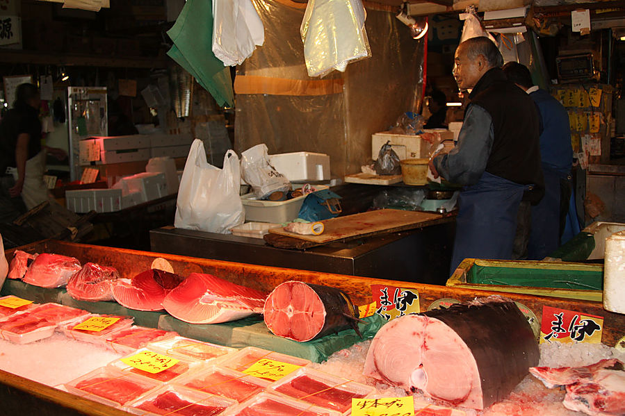 На сами торги тунца я опоздал — он начинается в пять утра ( для его посещения необходимо получить разрешение, их выдаётся 120 в день). Сам рынок начинает работать в три утра, с разгрузки рыболовецких шхун. Первое что я увидел: огромное число электрических тележек доставляли купленную и уже упакованную продукцию к машинам аукционеров. На сам рынок разрешается проходить туристам с 9.00 утра, но это правило соблюдается не очень строго ( чтобы не сильно бросаться в глаза уберите фотоаппарат под куртку, ходите по рынку по не главным проходам). На рынке можно распознать до 400 видов различных морепродуктов, ежедневно здесь продаётся 2000 тонн того что ещё несколько часов назад плавало в океане, от маленьких сардин до морских огурцов!