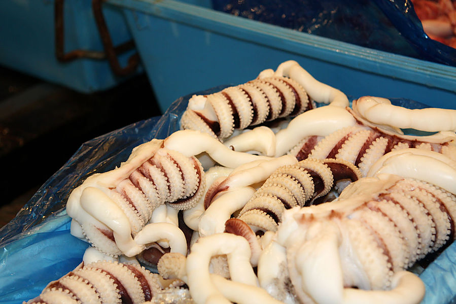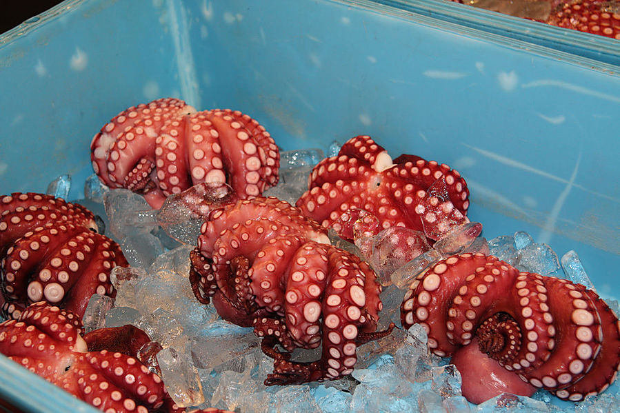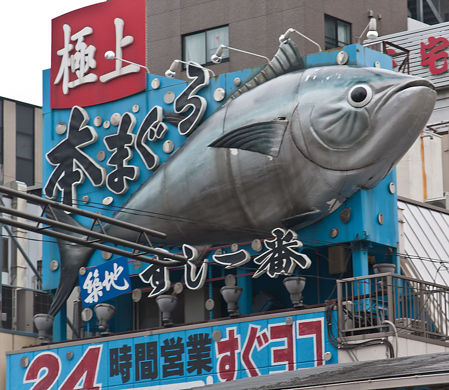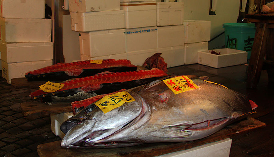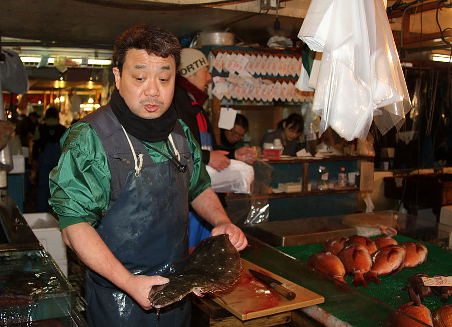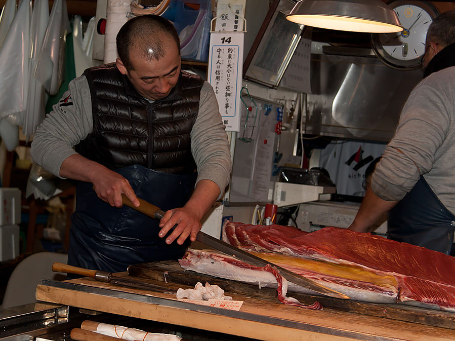 На сами торги тунца я опоздал — он начинается в пять утра ( для его посещения необходимо получить разрешение, их выдаётся 120 в день). Сам рынок начинает работать в три утра, с разгрузки рыболовецких шхун. Первое что я увидел: огромное число электрических тележек доставляли купленную и уже упакованную продукцию к машинам аукционеров. На сам рынок разрешается проходить туристам с 9.00 утра, но это правило соблюдается не очень строго ( чтобы не сильно бросаться в глаза уберите фотоаппарат под куртку, ходите по рынку по не главным проходам). На рынке можно распознать до 400 видов различных морепродуктов, ежедневно здесь продаётся 2000 тонн того что ещё несколько часов назад плавало в океане, от маленьких сардин до морских огурцов!