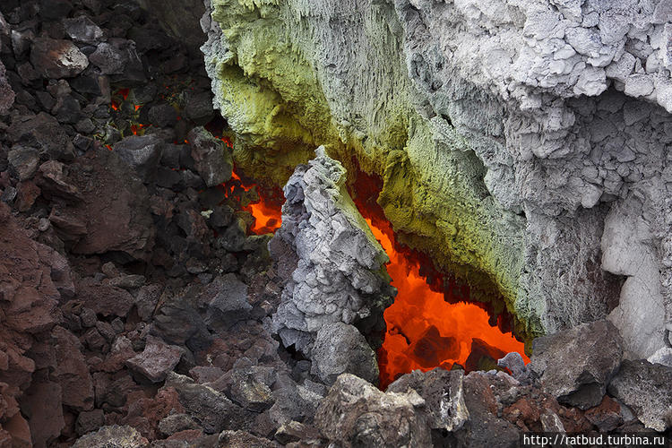 Местами выходят раскаленные газы, оставляющие на остывшей лаве осадки разных цветов и форм.