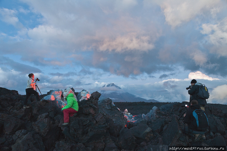 Немного подробнее остановлюсь и расскажу о таких явлениях, как лавовые трубы. С открытием и исследованием лавовых пещер и тоннелей появилась вулканоспелеология – часть спелеологии, ставящая своей целью изучение этих феноменов. Эти обширные пустоты в лавовых потоках возникают в процессе вулканических извержений и их природа стала изучаться на Камчатке относительно недавно. Эти же самые явления мне пришлось увидеть и во время моего посещения извержения. При перемещении по остывающему лавовому потоку в разных местах можно было наблюдать провалы, так называемые окна. Это как раз было не что иное, как обрушившиеся участки кровли лавовых труб. Что характерно, протяжённость этих труб может составлять несколько километров. Судить об этом можно по тому факту, что уже к лету непосредственно у очага извержения изливаний лавы по поверхности не было. Но были отмечены выходы лавы на поверхность в 4-5 км ниже по потоку. Существуют несколько версий их образования.