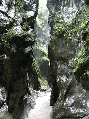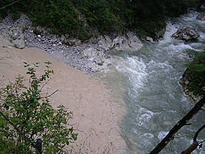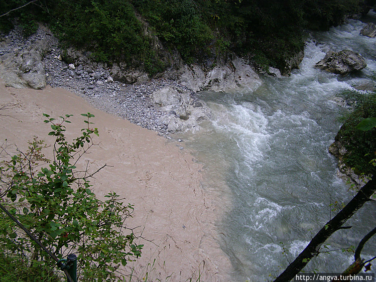 Мы попали в Толмин после сильной грозы , и единственным живым человеком в заповеднике была барышня в кассе . Она заботливо предупредила , что почва мокрая , и мы должны быть осторожны . Через лес мы вышли к берегу реки ,которая после дождя превратилась в бурный поток . Чтоб ее перейти пришлось пересечь Мост Дьявола — подвесной деревянный мост , который шатается от каждого чиха . Вскоре тропка привела нас к месту слияния двух рек . В одной из них вода была синяя , а в другой — серая , с илом .
