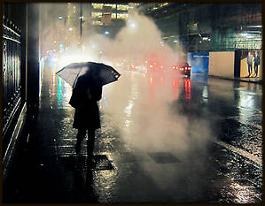 На углу одного из дома с хорошей техникой можно было бы сделать классные снимки. Идет дождь, огни, люди с зонтами, а из люка валит пар.