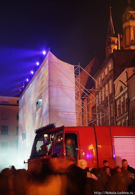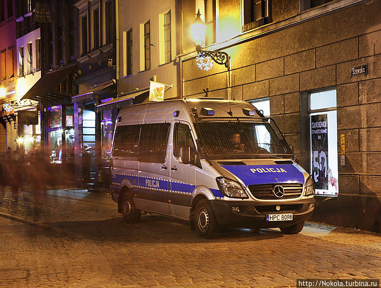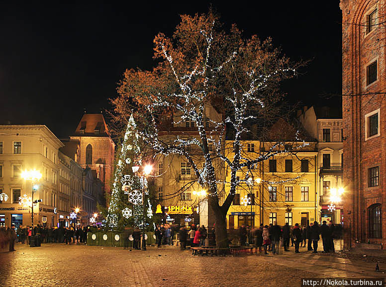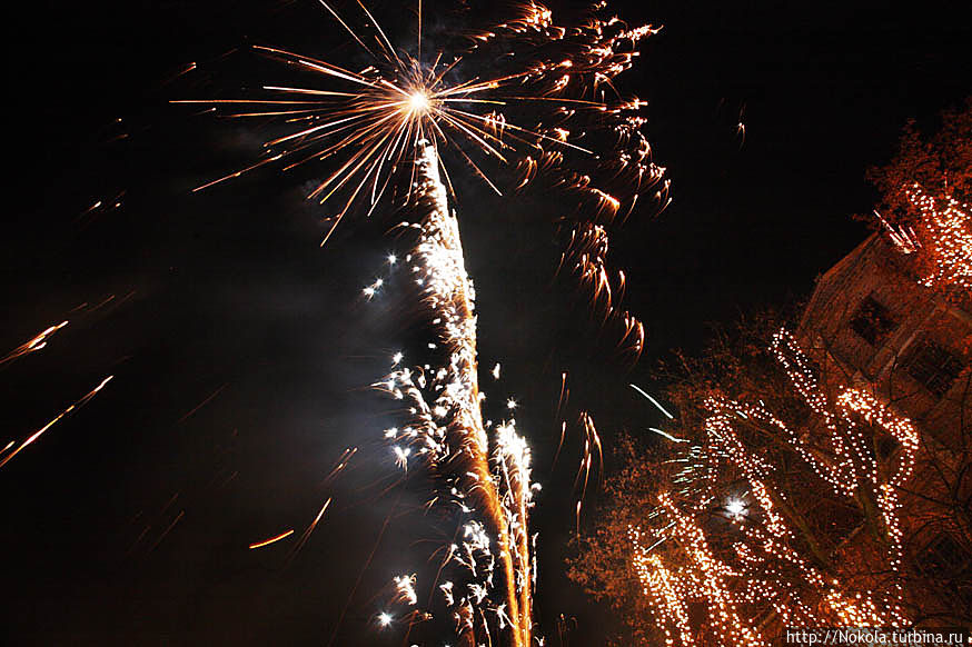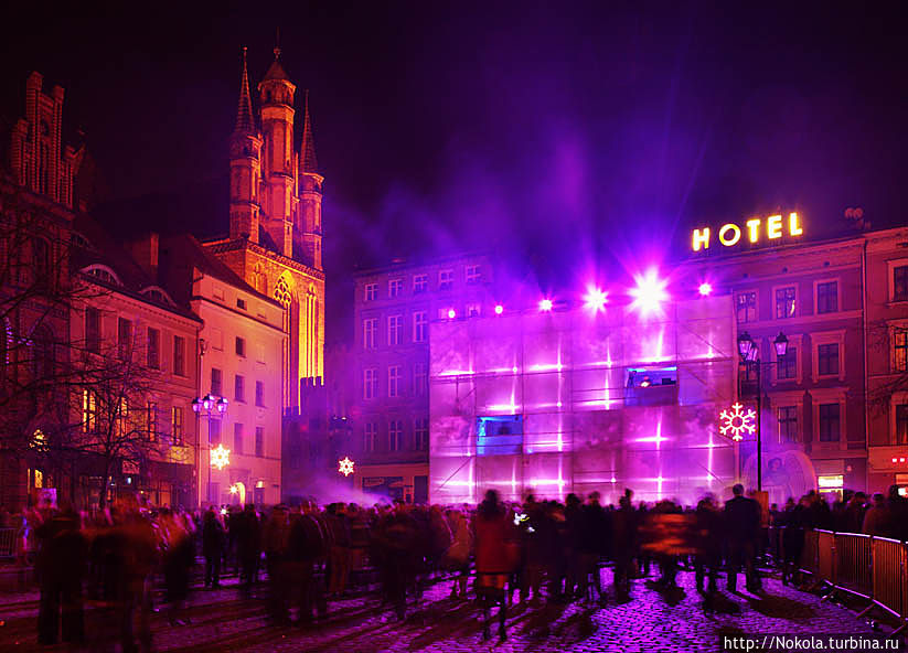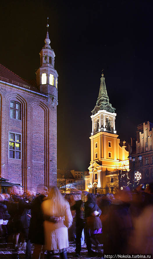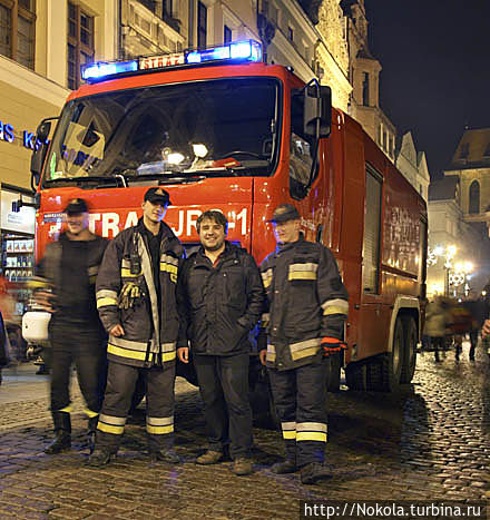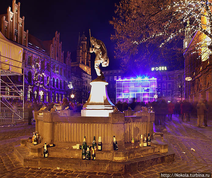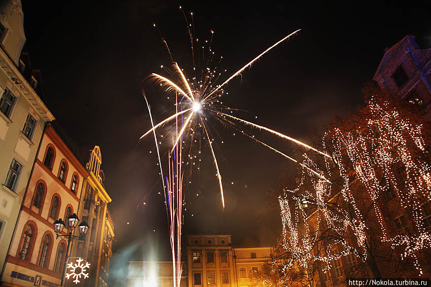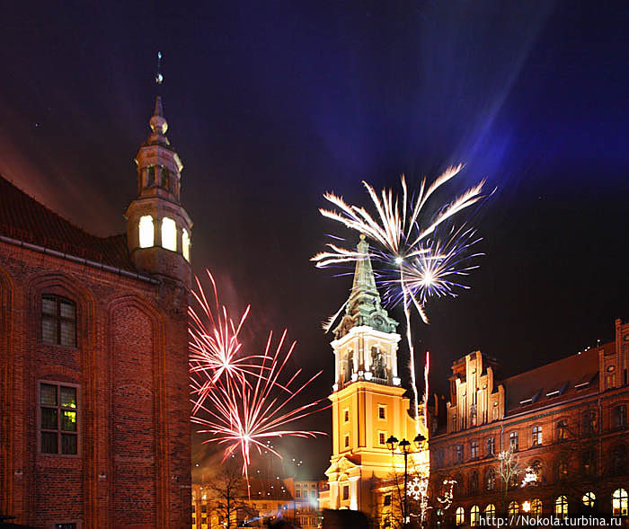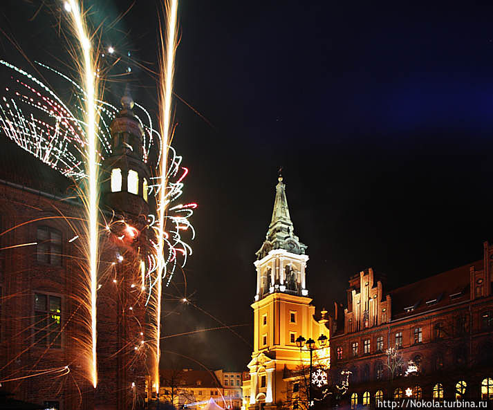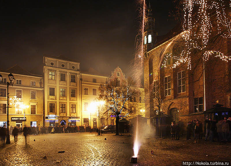 Празднование Нового Года в городе начинается задолго до двенадцати. Нетерпеливые жители начинают запускать фейерверки еще засветло. Так что резать салаты приходится под звуки разрывающихся петард. Дискотека на главной площади началась за два часа до праздника, но основная масса горожан потянулась на рыночную площадь минут за двадцать до наступления события. В Польше запрещено распитие любых спиртных напитков (включая пиво) на улице, но этот вечер — исключение, и молодежь шла на место праздника, гордо попивая из горлышек шампанское. Причем, основная масса людей употребляла не какие-то виноградные шипучие напитки, а газированный продукт с русскими надписями — Советское шампанское, Игристое шампанское, Кремльовское шампанское (орфография сохранена), коими полны супермаркеты. Вот какая-то такая традиция, оставшаяся со времен социализма. А когда со сцены после отсчета секунд объявят наступление праздника, начинается файер-шоу. На выделенную площадку люди приносят принесенные с собой фейерверки и под музыку в небе расцветают огни. По ходу действия многие бьют о булыжник бокалы и бутылки. Я не сторонник битья посуды, но некоторые видят в этом какой-то символизм. По всему центру стоят полиция и пожарные, с которыми все фотографируются. А некоторые пытаются сняться даже в кабине машины, чему никто не препятствует. В общем, торуньский Новый Год веселый и задорный.