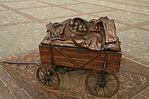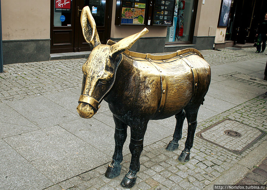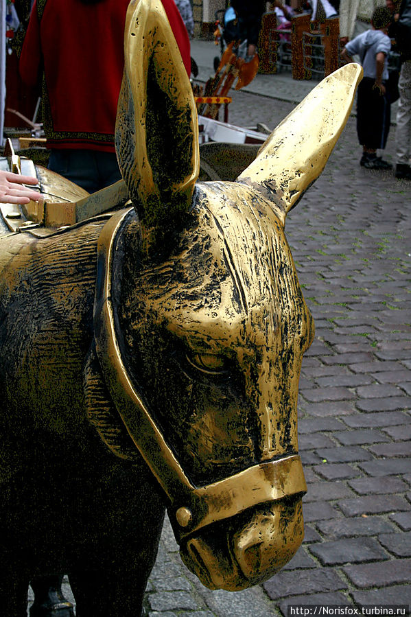 Это не просто медная статуя. Когда-то этот ослик был деревянным и выполнял роль "Позорного столба" — правонарушителей усаживали верхом на растянутый вдоль хребта металлический гребень, к ногам привязывали кирпичи. Так они и сидели на глазах у прохожих. Сейчас на ослике с удовольствием и по собственной воле сидят детишки. Причем постоянно, сфотографировать ослика без седаков очень проблематично:))).