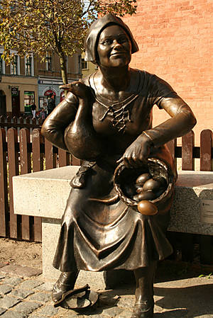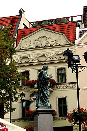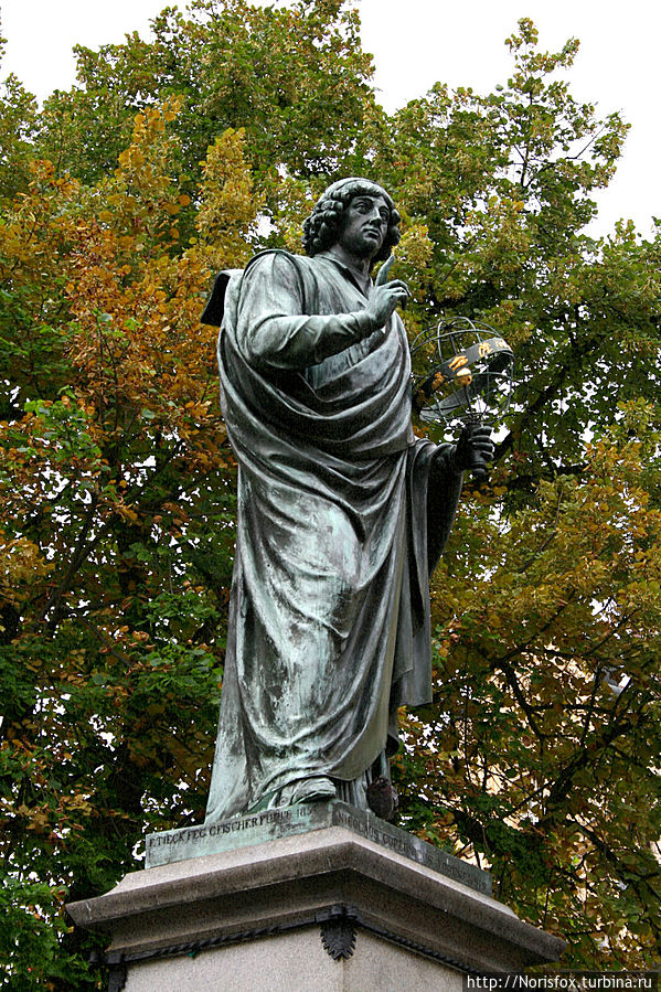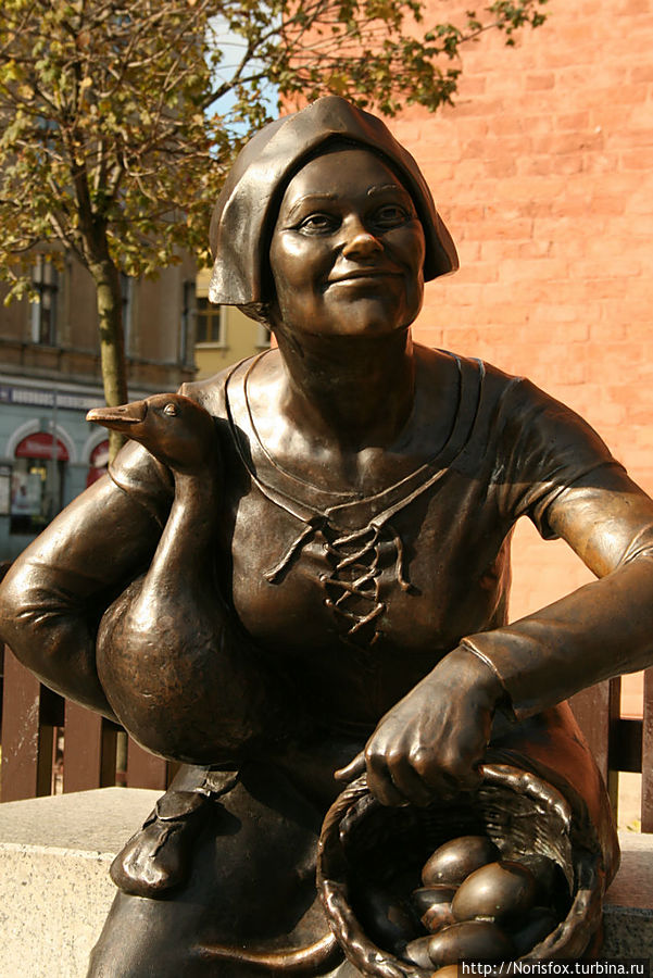 с Новомейского рынка, торгующая гусиными яйцами. Под мышкой у нее гусыня, под ногами весы. Падающее яйцо, судя по необыкновенному блеску, приносит Счастье и Удачу! Авторами этой скульптуры являются супруги Anety и Macieja Jagodzińskich — Jagenmeer — выпускники факультета изобразительных искусств Университета Николая Коперника в Торуни. В 2011 году они были премированы девятью тысячами злотых за эту работу.Сказать здесь про главный, с моей точки зрения, торуньский аксессуар необходимо. Хотя я о нем тоже уже упомянала. Это памятник самому известному торунянину — Копернику. Видно, что сделан он с огромной гордостью и любовью, настолько красив...