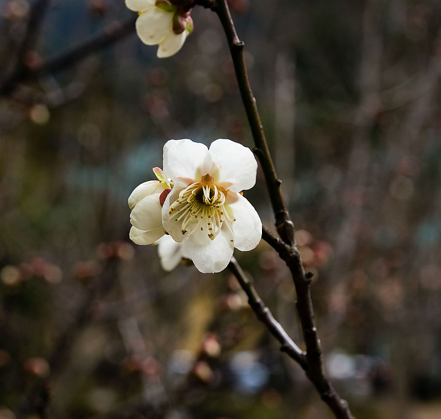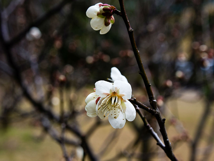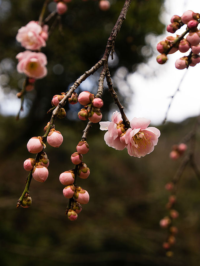 Хотя у каждого цветущего растения в Японии есть свой определённый период цветения, в реальности дервья и цветы зацветают как попало. Зависит от сорта, от местности, от того, как падает солнышко. Можно увидеть цветущую сливу в декабре и сакуру в феврале. Данная конкретная слива зацветает, в общем, как положено.