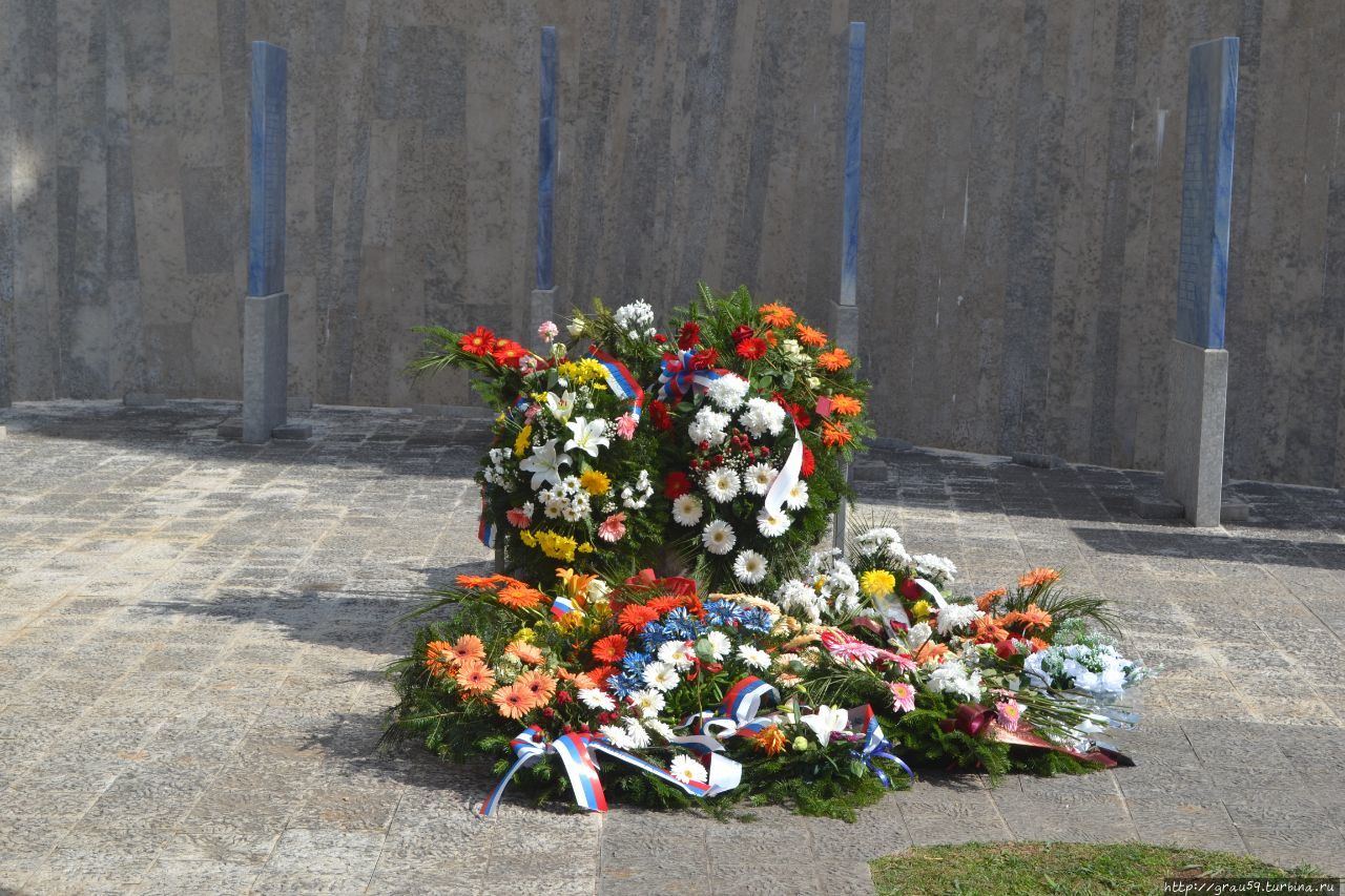 Из-за мемориальной доски с именами погибших поднимается ситилизированная форма горы Леотар с крестом наверху.