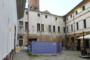 Справа от монумента еще один символ города — Дворец Треченто или Дворец Трехсот. Название идет от количества членов городского совета, заседавших в этом здании. Внутри сохранились фрески венецианских мастеров XIV-XVI века, а также гербы различных представителей местной власти. Большой зал палаццо сегодня используется как конференц-зал и главный выставочный салон города. Особенно интересна галерея первого этажа. Здесь под стеклянными куполами находятся две старинные скульптуры. Одна из них — это скульптура Святого Либералия, покровителя Тревизо. Либералий (он умер в 400х годах) —священномученик из Анконы, умерший за православную религию. Его мощи хранятся в кафедральном соборе города «Дуомо». Вторая — оригинал фонтана «Fontana delle Tette». В переводи фонтан женской груди. Установили этот фонтан в 1559 году на улочке позади дворца Преторио в честь одной из побед над Венецианской республикой. По легенде, первые три дня из груди струилось виноградное вино. Причем из одной красное, а из другой белое. После еще трижды на выборах нового подесты /городского головы/ фонтан заряжали вином. Сейчас копия фонтана стоит в небольшом дворике на улице Vicolo del podestà.