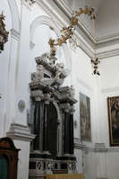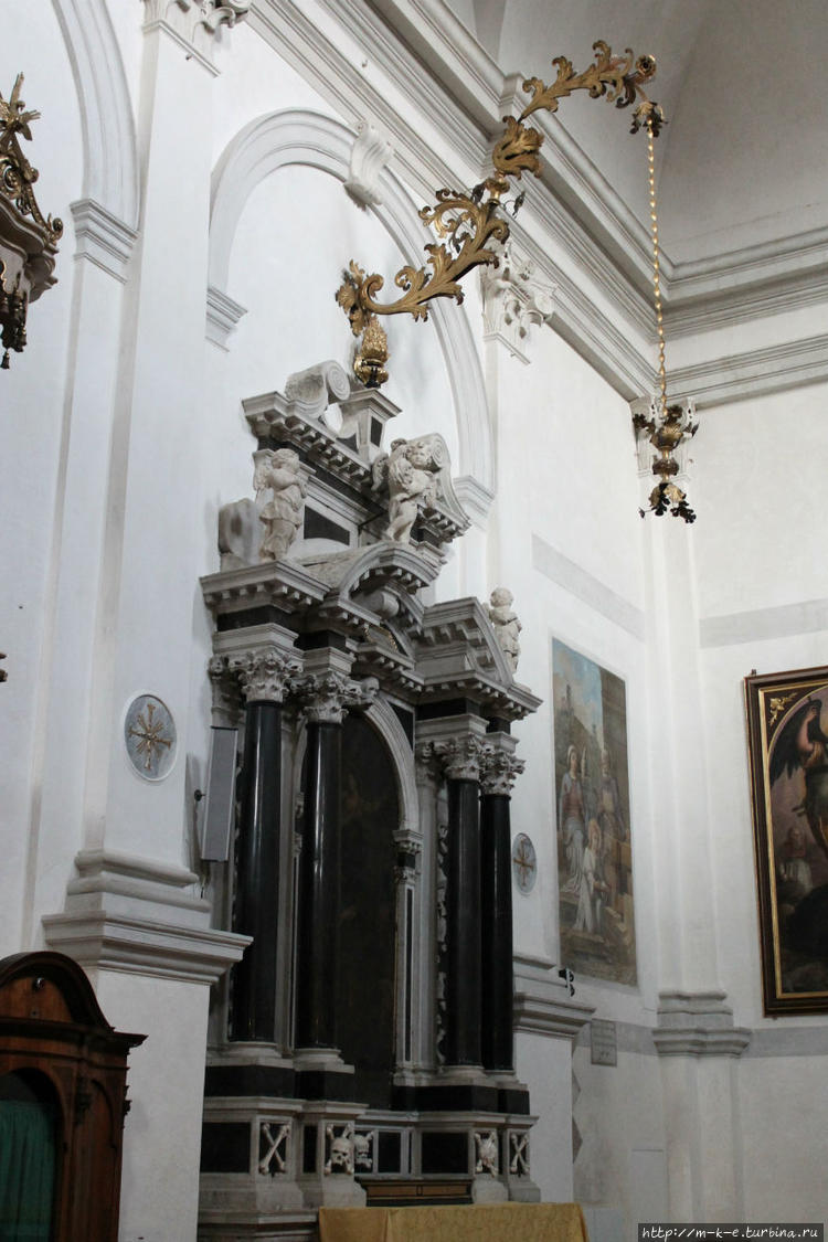Внутри церкви один большой зал в белых тонах. За престолом образа Святого Михаила и Святого Леонардо, выполненные художником Людовиком Поззосерато"Il Pozzoserrato". Фотографируя интерьер церкви только дома рассмотрел особенность одного алтаря с большим количеством черепов. Над алтарем надпись : Привилегированный алтарь на каждый день. Интересное сочетание черепа и привелегированности.