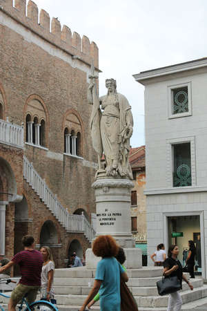 Поворот направо на улицу Santa Margherita приводит нас на Piazzetta Indipendenza. В ее центре стоит «Монумент павшим за свободу Италии» – один из символов Тревизо. Мраморная женская фигура, которую местные жители называют «Teresona» – аллегорический образ Италии, которая левой ногой наступила на разбитые цепи подчинения Австрии (это прошлое страны), а у ее правой ноги находится рог изобилия (это будущее). Памятник посвящен павшим героям, отдавшим свои жизни в тяжелой борьбе за объединение Итальянского королевства в 1797-1866 годах.