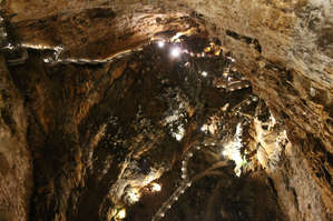 В конце экскурсии при долгом подъеме сделал я снимок противоположной стены, там где мы спускались. Этот снимок далекой лестницы дает лишь малое подтверждение размерам грота. В кадр попадает и столб высотой 120 метров. Это научное оборудование, следящее за колебаниями земной коры.