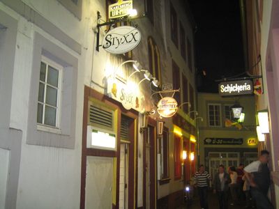 Свернув в сторону, мы попадаем на узкую улочку, на которой находится самый древний дом еврейского квартала (на нем вывеска StyXX). Сейчас на этой улице находятся клубы, кафе, из них с одуряющей громкостью несется музыка. Стенки улицы подпирают нетрезвые молодые люди, форма одежды которых навевает размышления об их принадлежности к неонацистам. Становится не по себе...