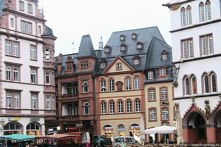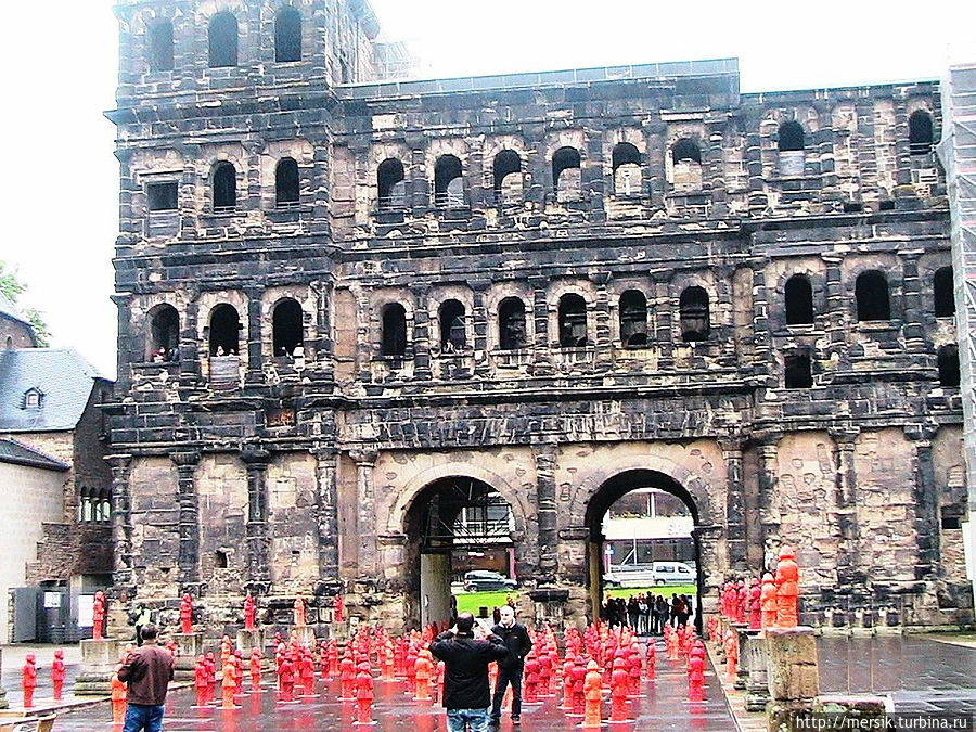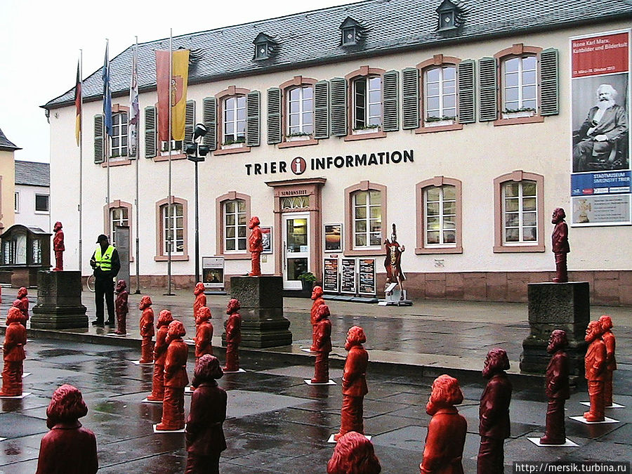 А в Трире нас снова поджидал дождь. И 16 градусов тепла. И это в последнюю неделю июня! Не в первый раз: когда мы были здесь в мае- шел дождь, в июне- снова шел дождь. Всего несколько часов- и мы сбежали от московской жары. В чудесный немецкий город , достопримечательные развалины которого, в небольшом количестве встречающиеся кое-где, внушают уважение к его возрасту, церкви и соборы радуют глаз умеренной лаконичностью, а рестораны и магазины, предлагающие неповторимые мозельские вина, оставляют самые приятные ощущения от счастливой возможности пробовать их в оригинальном варианте. До чего ж хорош их trocken рислинг, легко на двоих в Weinstube Kesselstatt можно "уговорить" бутылочку, а может и две. После этого отправиться к Porta Nigra посмотреть на сотню красных пластмассовых Марксов, из чувства солидарности, но не удовольствия побродить по подземным туннелям Kaiserthermen, "покопаться" в истории в Rhineland Museum